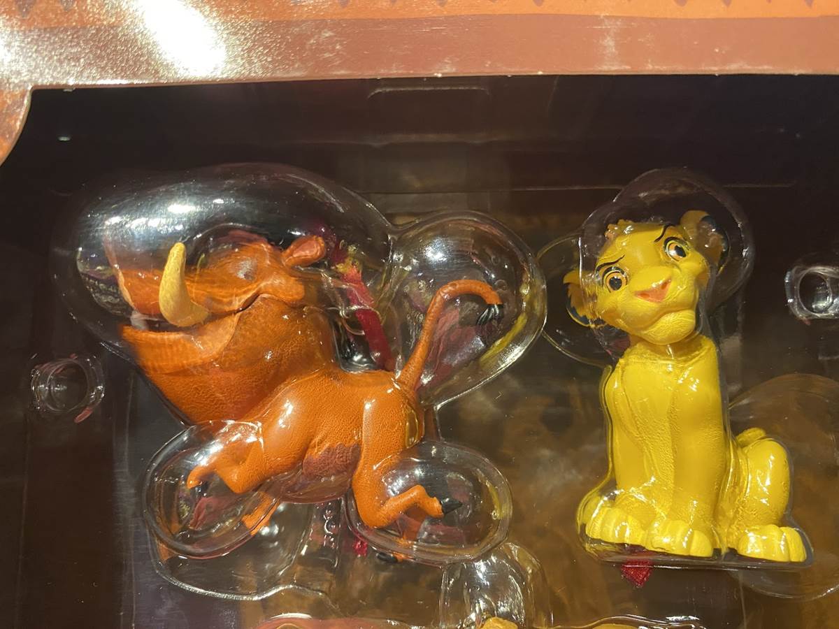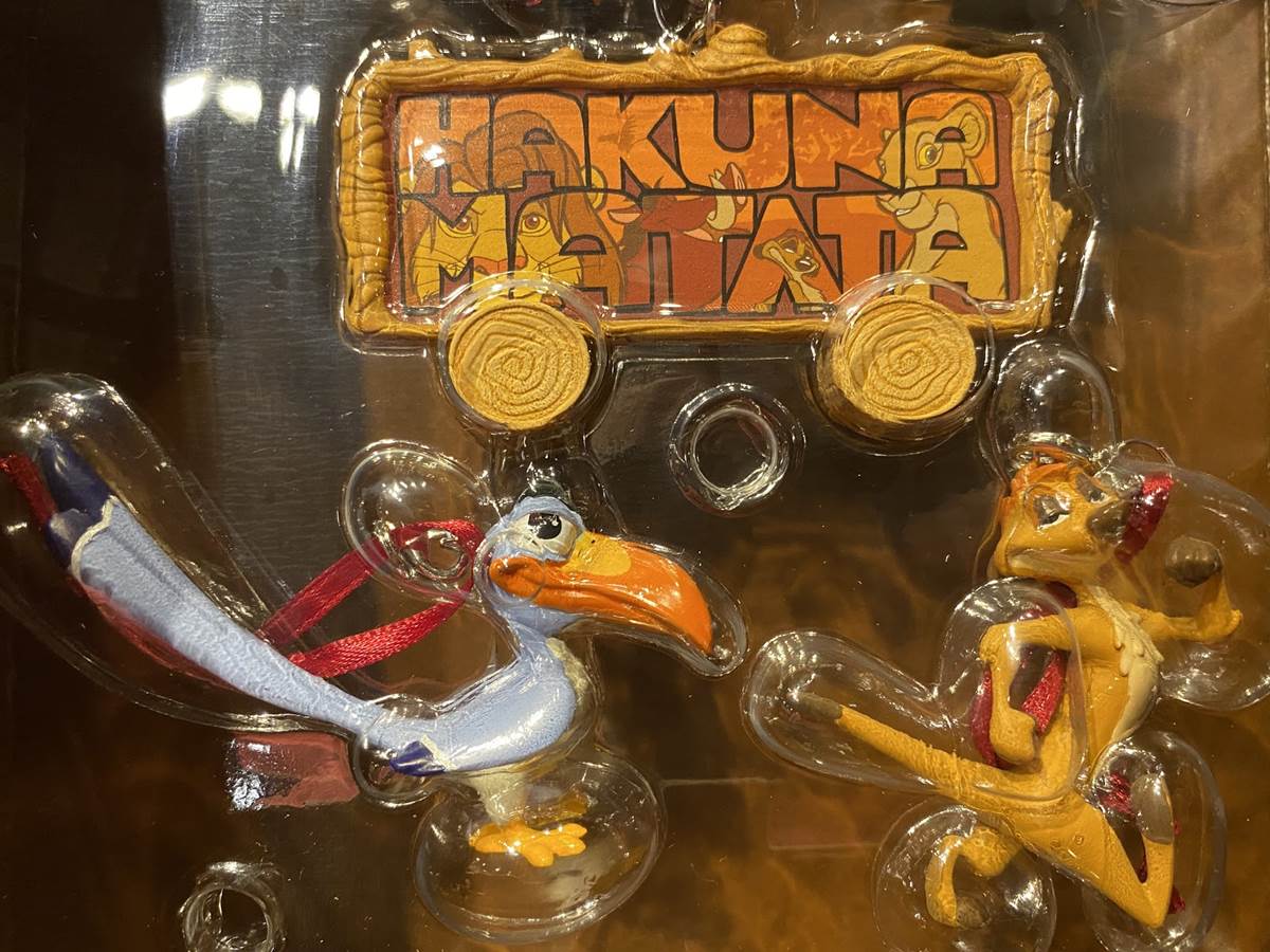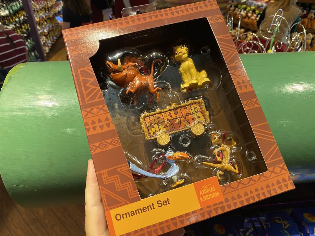 The Lion King set includes an ornament that says “Hakuna Matata” and character ornaments of young Simba, Timon, Pumba, and Zazu.