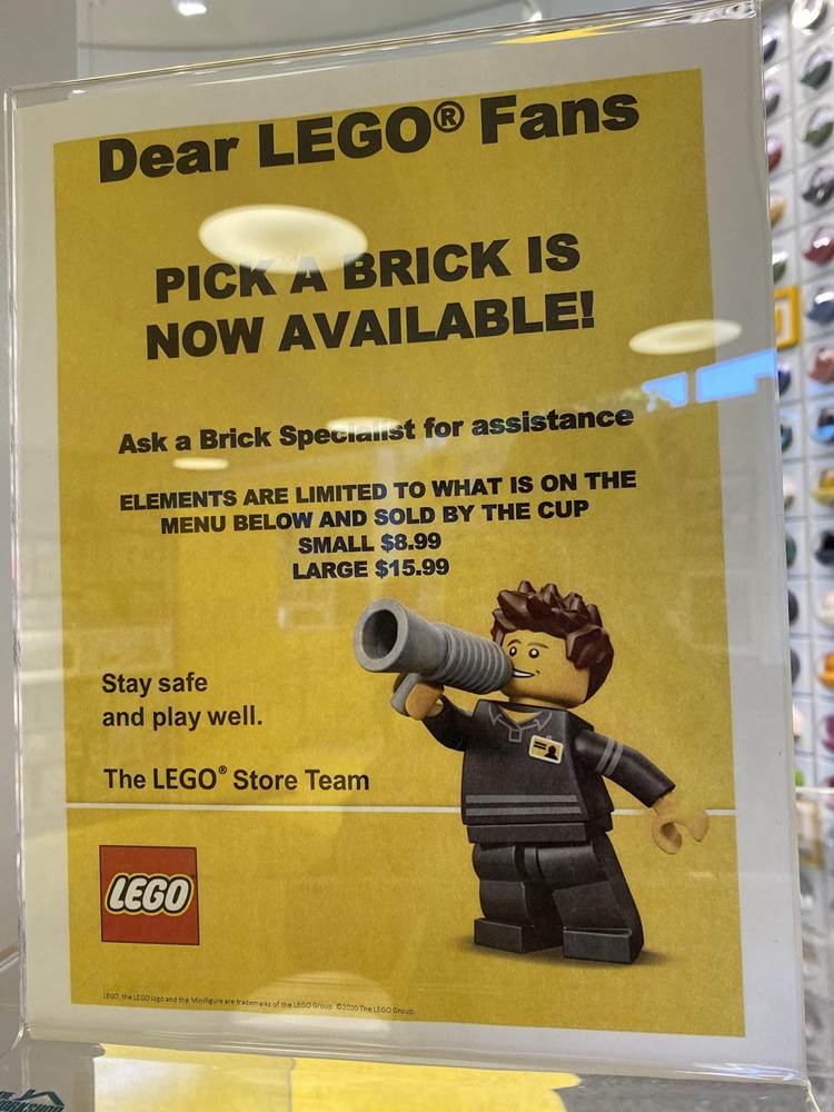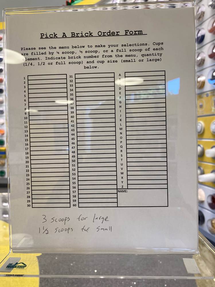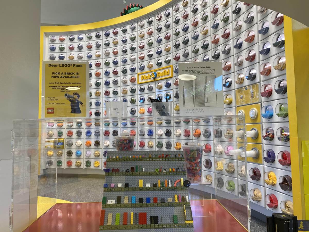 The “Pick-A-Brick” wall is blocked off, but Guests can fill out a request form and an employee will grab the bricks they need for them.