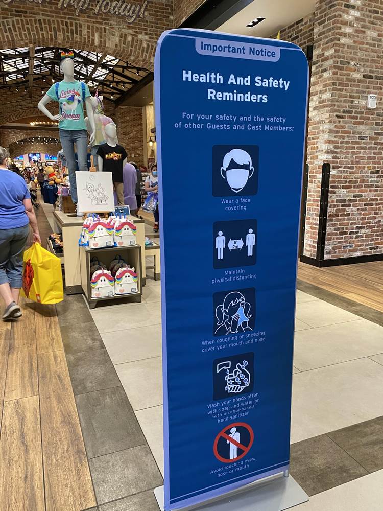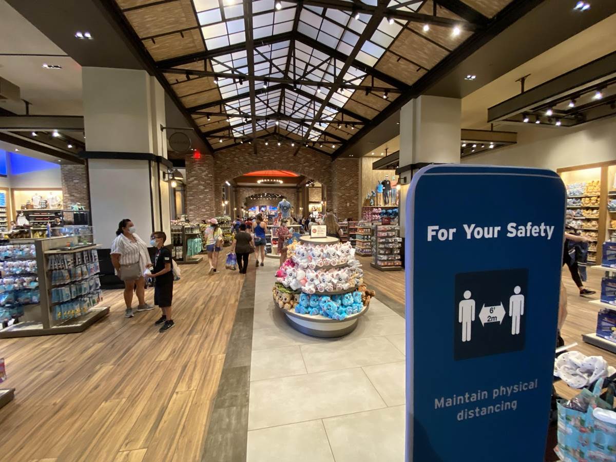 Just like outside, signage throughout World of Disney reminds Guests to keep their face covered and stay six-feet apart from other groups.