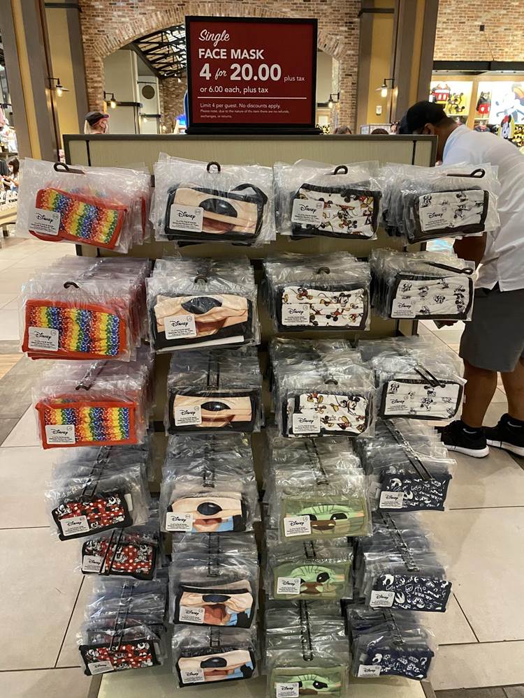 The themed face masks that debuted on shopDisney are available for sale with a few styles that have so far been exclusive to the parks including Goofy, a Star Wars pattern, and a rainbow Mickey theme. The face masks are $6 each with a special deal where Guests can save $4 when they buy four masks for $20. Unlike on shopDisney where masks are sold in a 4-pack by theme, Guests can pick and choose their masks at World of Disney.