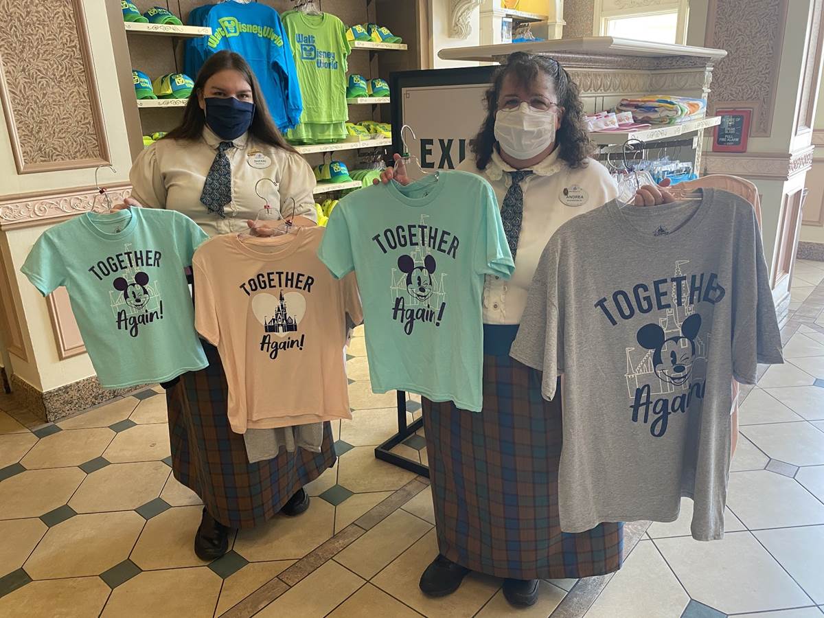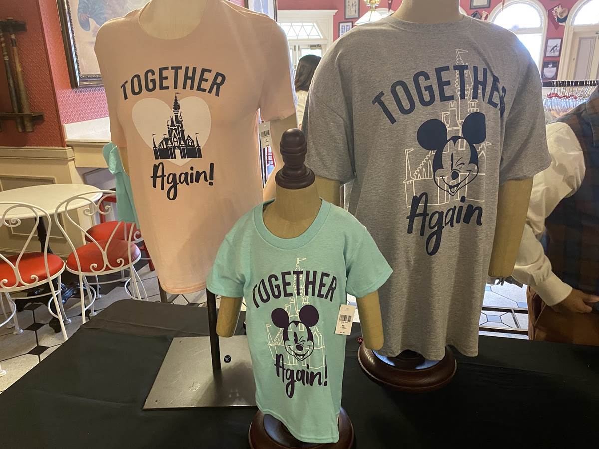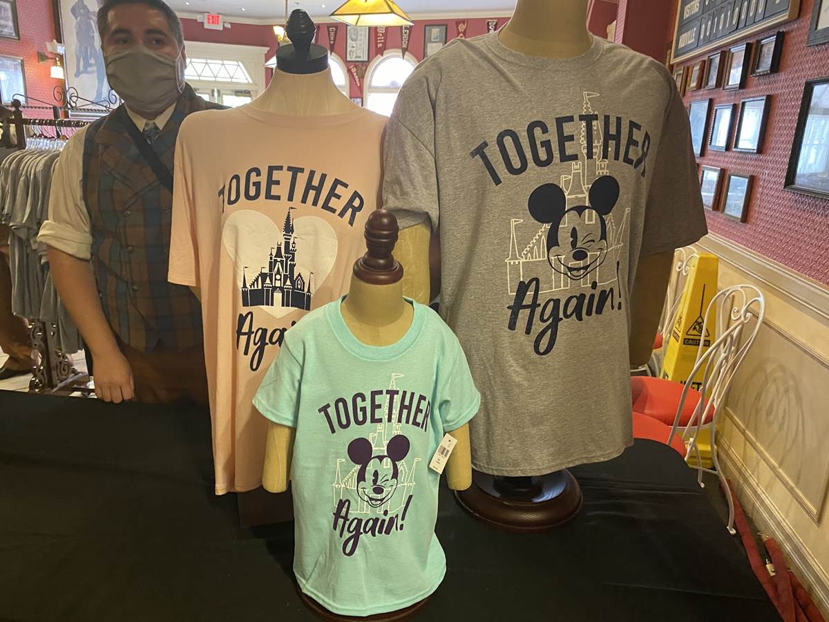 Walt Disney World has released a new collection of t-shirts to celebrate the reopening of their parks that say “Together Again!” on them.