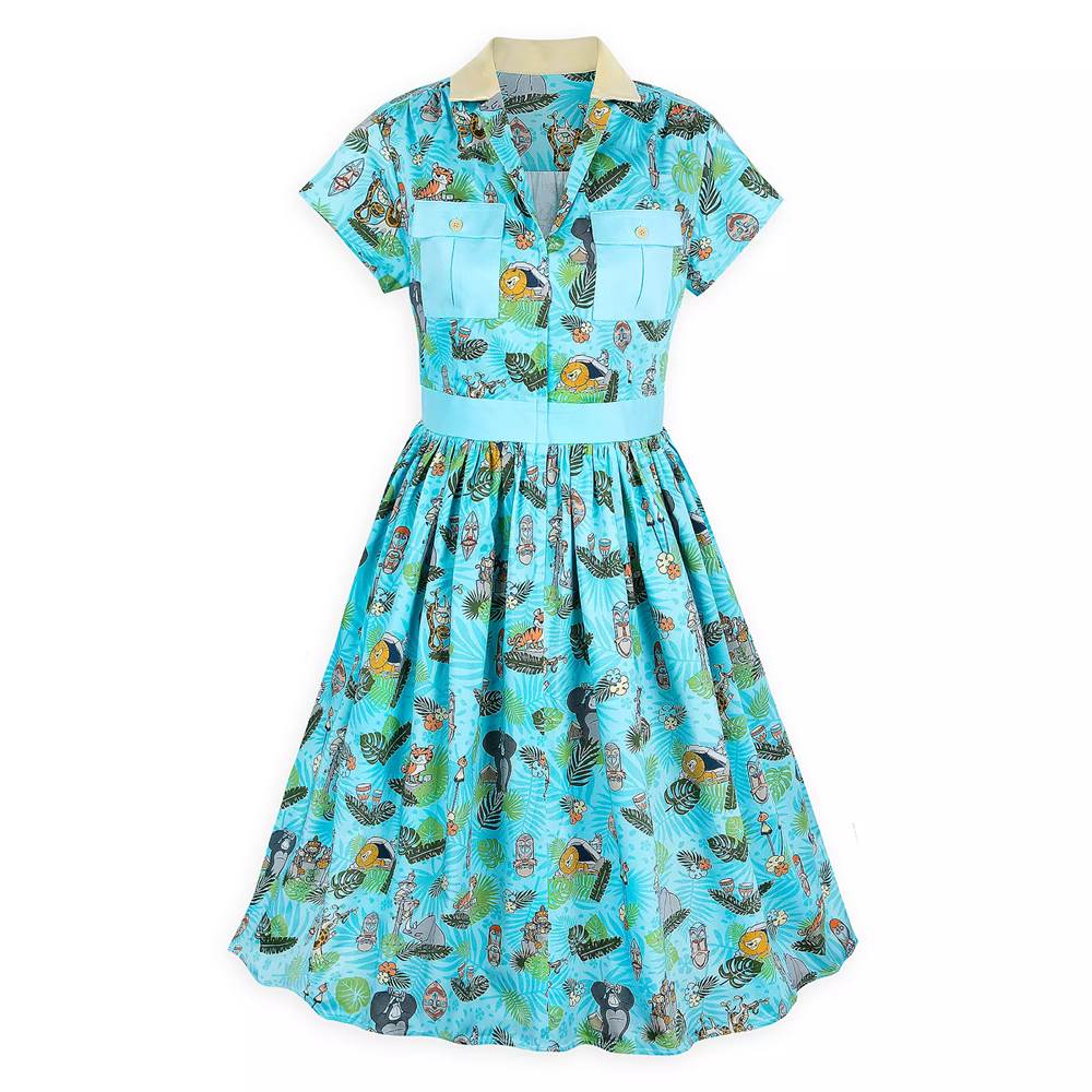 The Jungle Cruise Dress caused quite a sensation at the Disney Dress Shop and now you can bring it home for $128, available in sizes XS to Plus3X. It features mid century stylized attraction icons and foliage patterns on a beautiful water blue color.