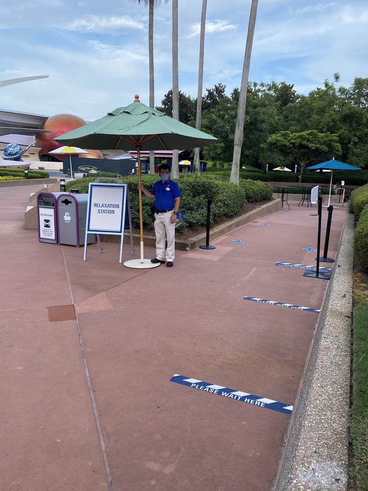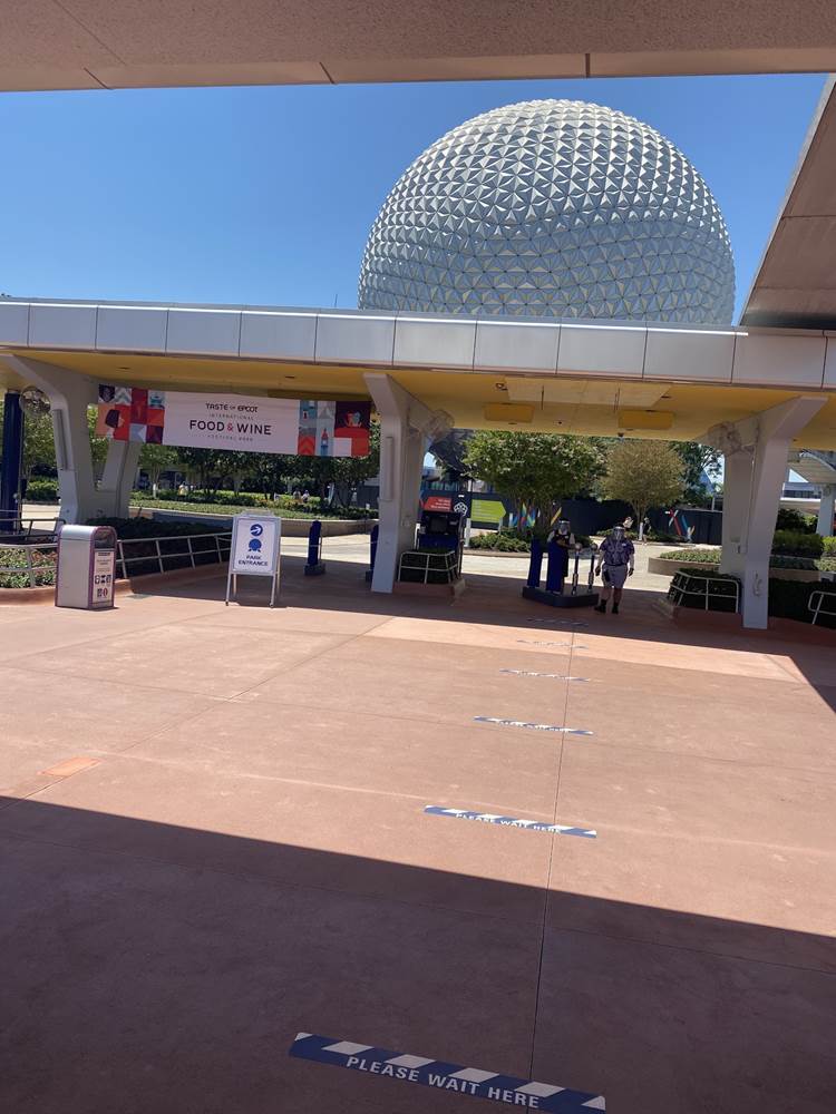 Like Magic Kingdom and Disney’s Animal Kingdom, Guests go through a temperature screening and touchless bag check before reaching the main entrance where social distance markers keep groups six-feet apart.