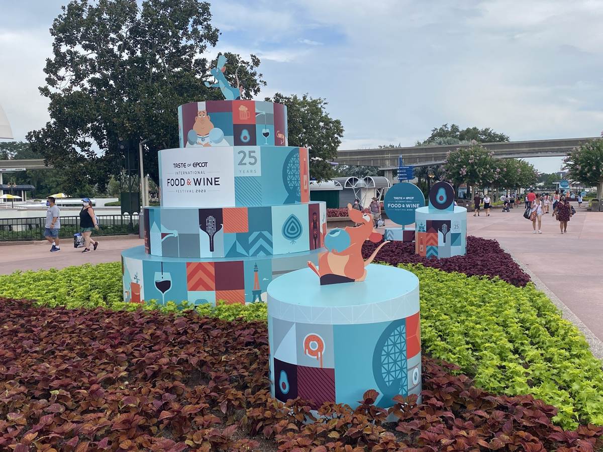 The cast of Pixar’s Ratatouille are the main character featured on park decor for the Taste of EPCOT International Food & Wine Festival.