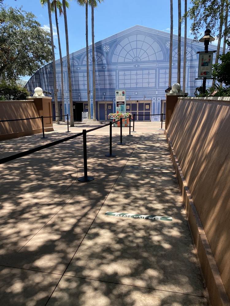 Like Magic Kingdom and Disney’s Animal Kingdom, Guests go through a temperature screening and touchless bag check before reaching the main entrance where social distance markers keep groups six-feet apart.