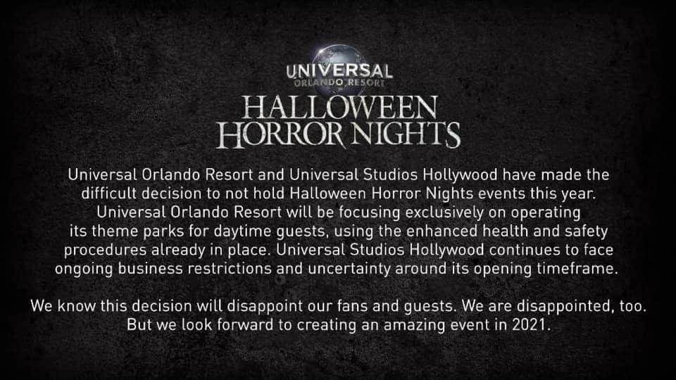 - In an earlier announcement this morning, Universal Orlando President and COO Bill Davis told Universal Team Members that much to everyone’s disappointment, Halloween Horror Nights would not be taking place this year.
