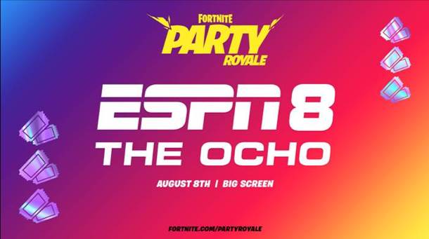 - Starting Saturday, August 8 at 9 am ET, Fortnite players can jump into Party Royale and watch ESPN 8: The Ocho.