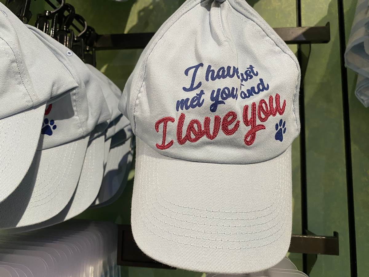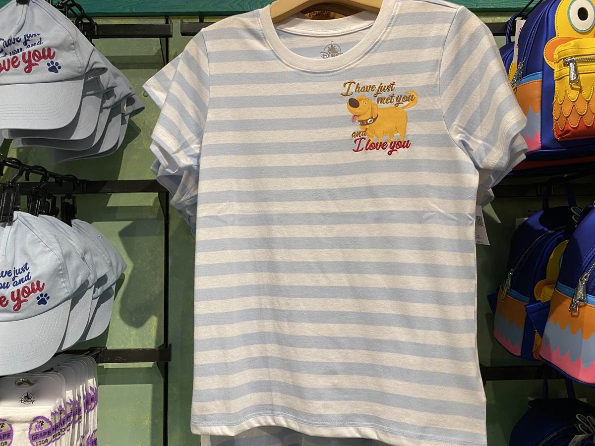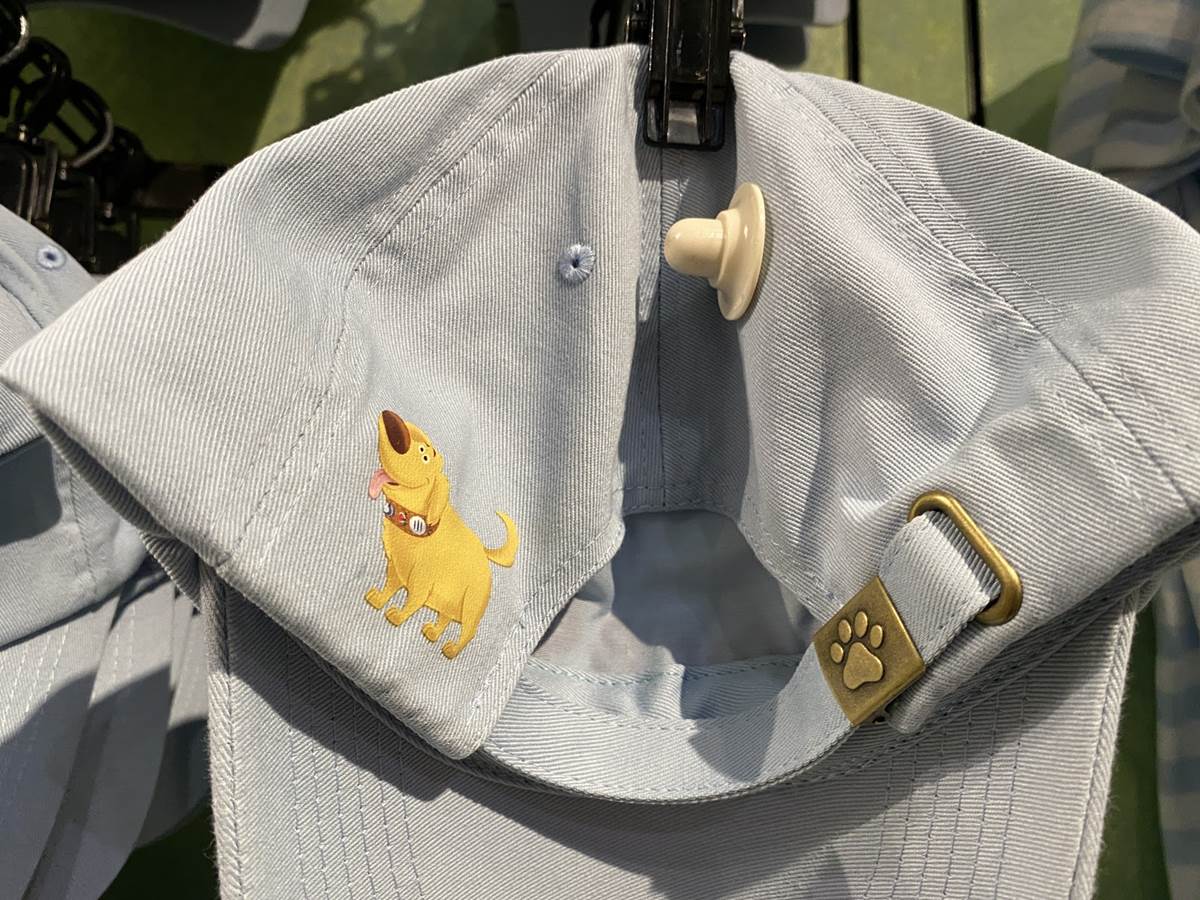 Speaking of Dug, he is also featured on a new t-shirt and adjustable baseball cap which are also emblazoned with his classic quote from the film, “I have just met you, and I love you.” Both Dug and the quote appear on the chestplate of the striped t-shirt, where the hat has the quote above the bill, and Dug appears on the backside of the cap, with a paw print engraved in the buckle of the adjustable strap. The shirt retails for $36.99 and the hat for $27.99