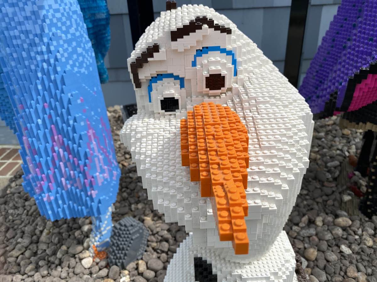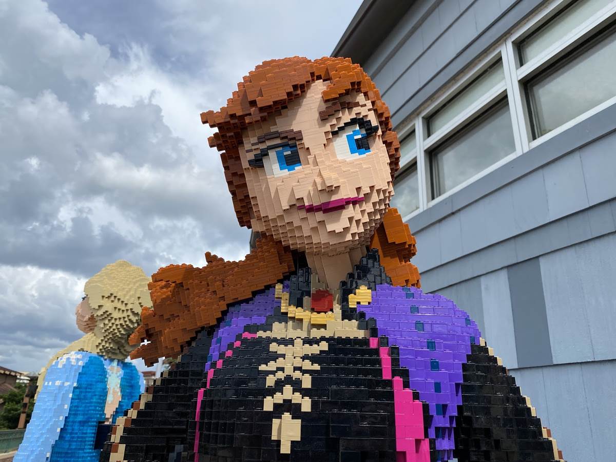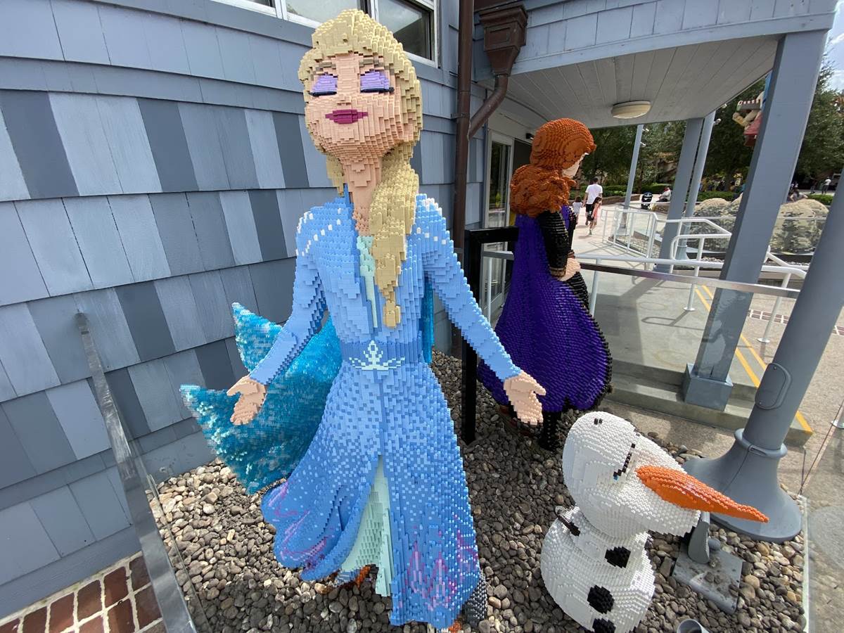 - From Frozen, we see Anna, Elsa, and Olaf in all their beautiful brick glory. Elsa appears to be staged mid-”Let It Go” performance, with Anna and Olaf looking out to all the guests passing by.
