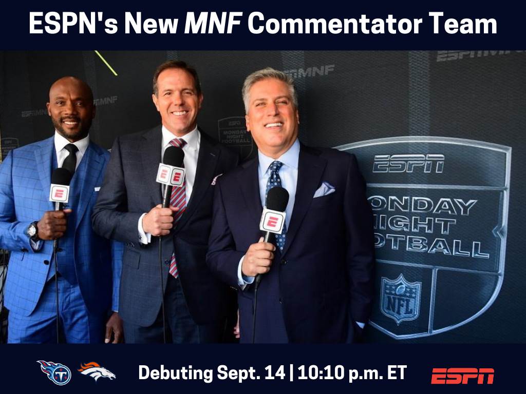 - ESPN’s new NFL commentating team will begin the season with the Tennessee Titans at the Denver Broncos on Monday, Sept. 14 (10:10 pm ET), the second game of ESPN’s annual Week 1 doubleheader.