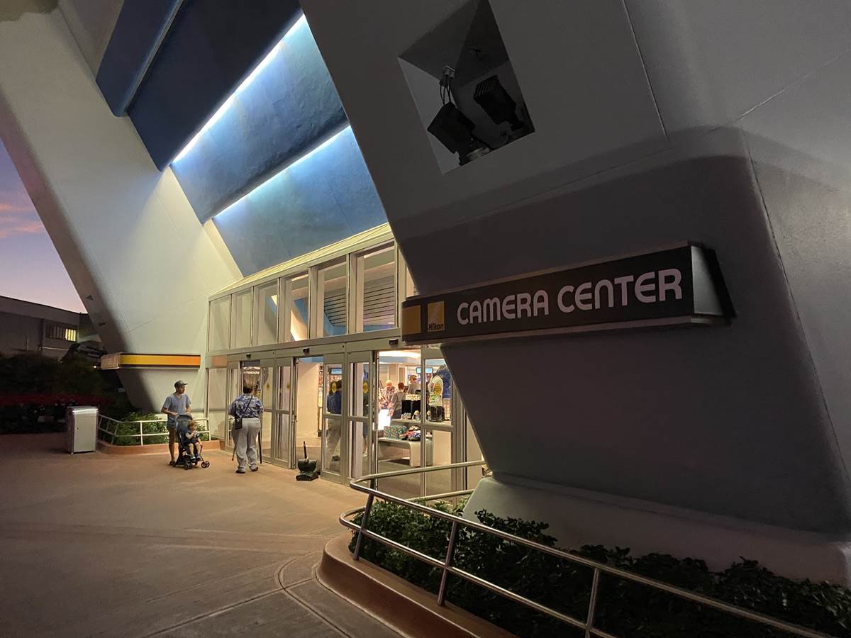 Signage on all three locations have now been updated to reflect a uniform look. They all have a charcoal grey base with white font that appears to be the same as before. Circular icons give Guests a visual queue about what they’ll find inside, with the Nikon logo in that place on the Camera Center. The signage also has an attractive blue light that casts a shadow on the Spaceship Earth support columns that border the entrance to these shops.