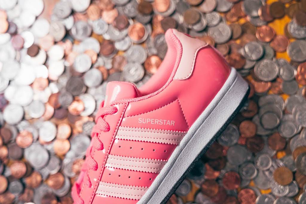 This iconic shell toe sneaker gets the Piggy Bank treatment with a patent leather upper and Hamm’s face on the back heel.