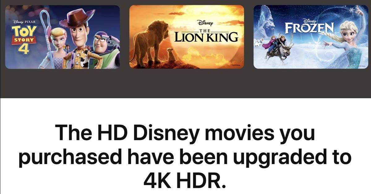 Disney movies are now available in 4K through Apple TV, with HD purchases automatically being upgraded in user accounts.