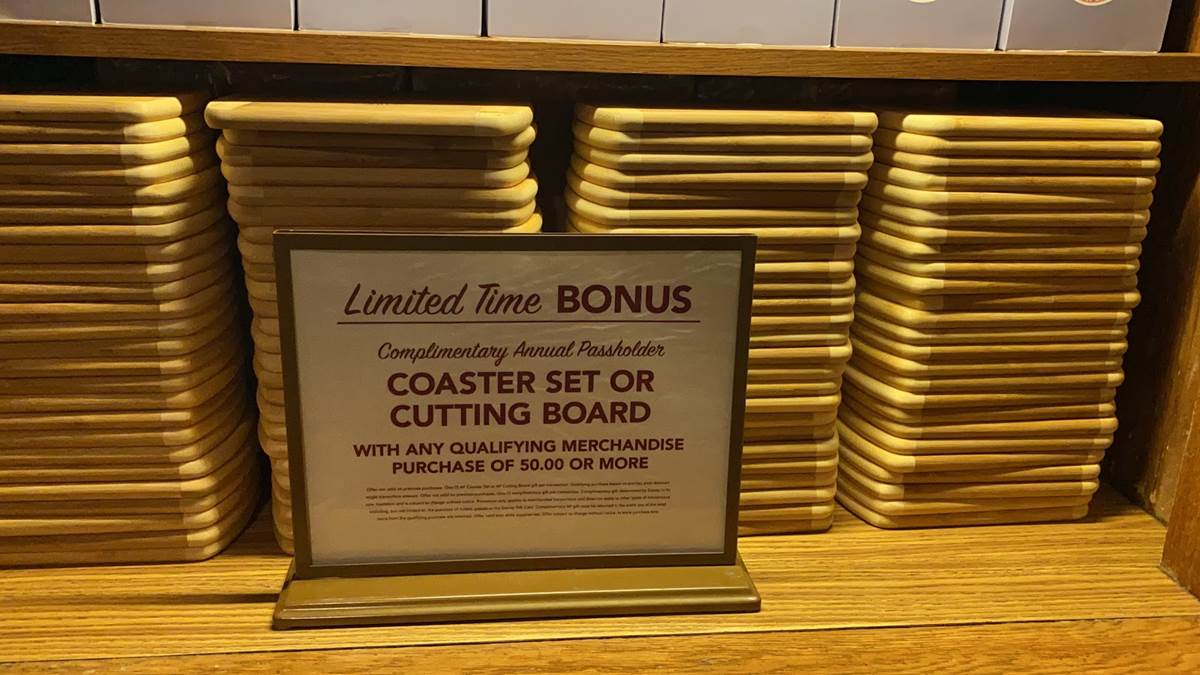 - Guests also get a free coaster set or cutting board with a purchase of $50 or more.