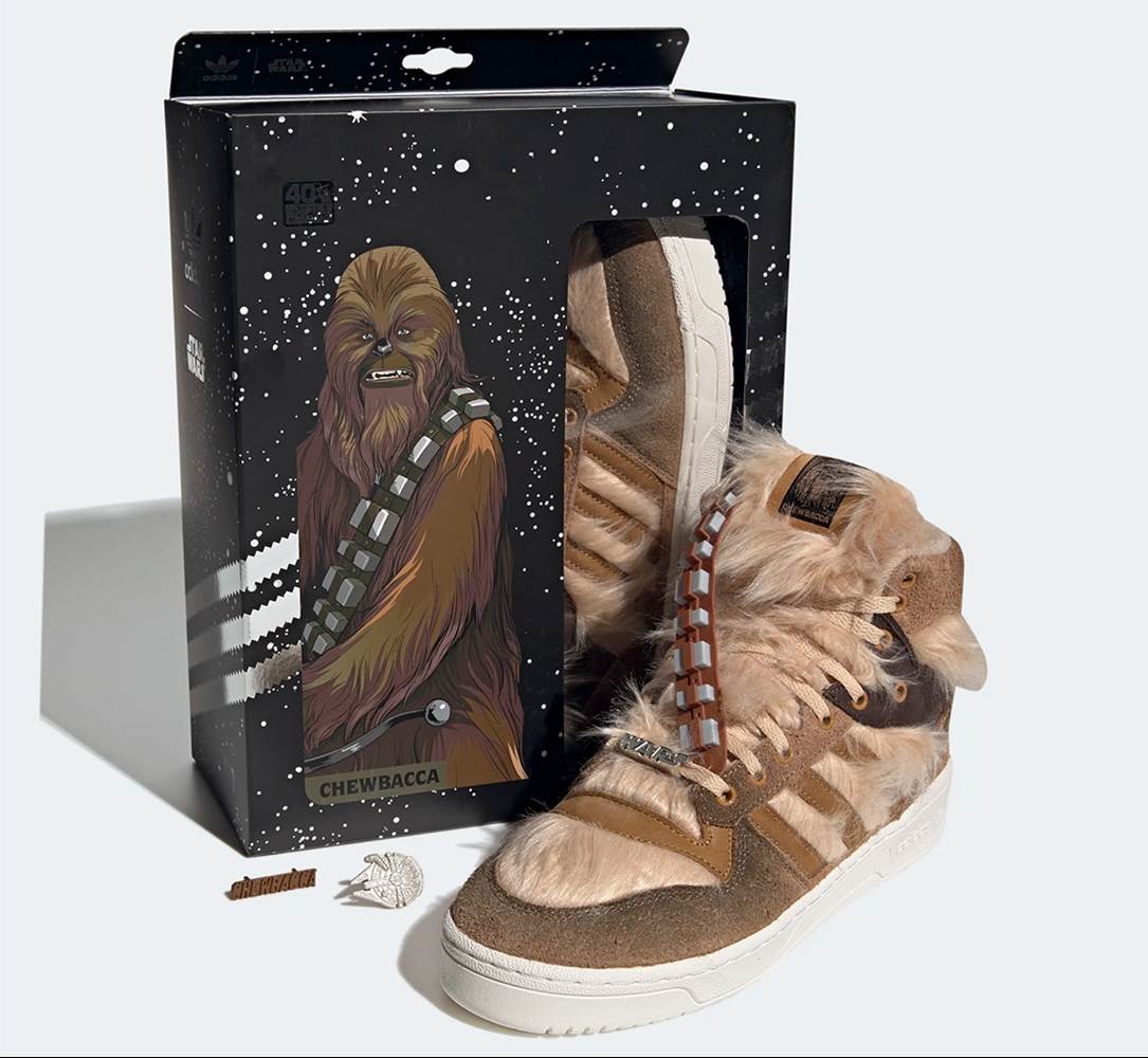 - Adidas will package the shoes in a collectable box that also comes with a Chewbacca poster and additional lace jewels of Chewbacca’s name and the Millennium Falcon.