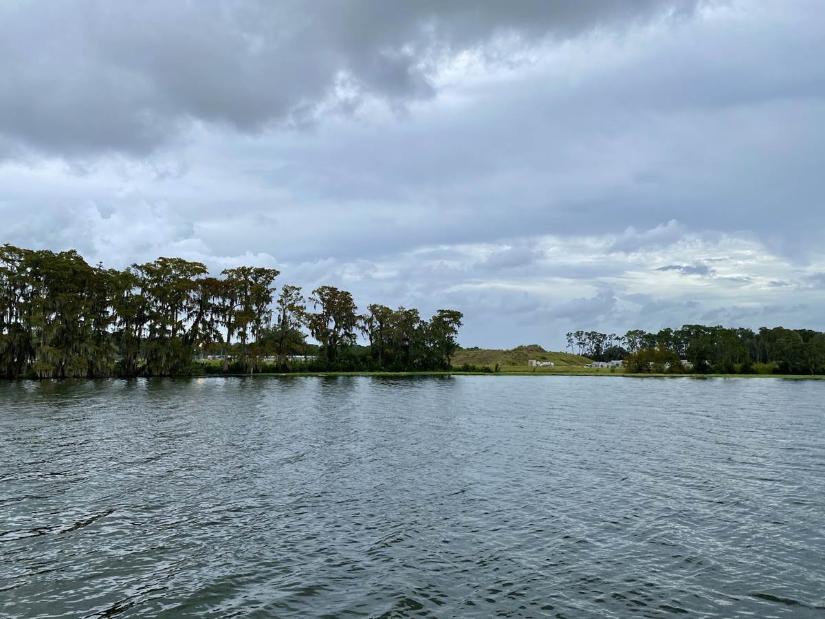 In the above photo, you can see that dirt had been moved around on the former River Country site next to the new Tri-Circle D Ranch, the long building to the left. The above photo was taken from Disney’s Contemporary Resort. Below is a photo of the same area taken from a boat on Bay Lake. You can see the stables through the trees and the mound of dirt looking about the same as it did in June, just with grass growing rather than the previously visible grass seed bed.