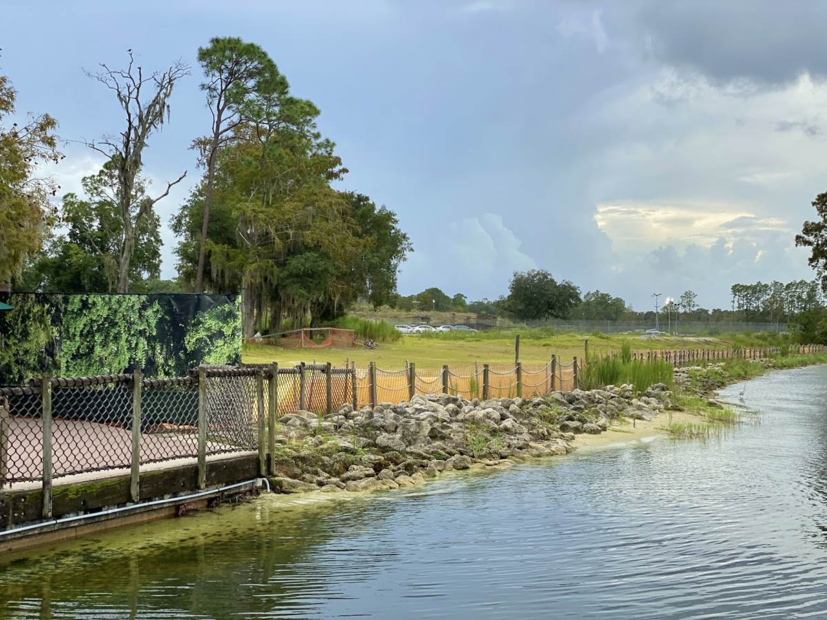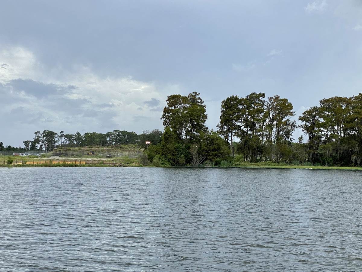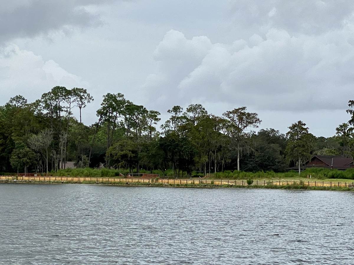 In the above photo, you can see that dirt had been moved around on the former River Country site next to the new Tri-Circle D Ranch, the long building to the left. The above photo was taken from Disney’s Contemporary Resort. Below is a photo of the same area taken from a boat on Bay Lake. You can see the stables through the trees and the mound of dirt looking about the same as it did in June, just with grass growing rather than the previously visible grass seed bed.