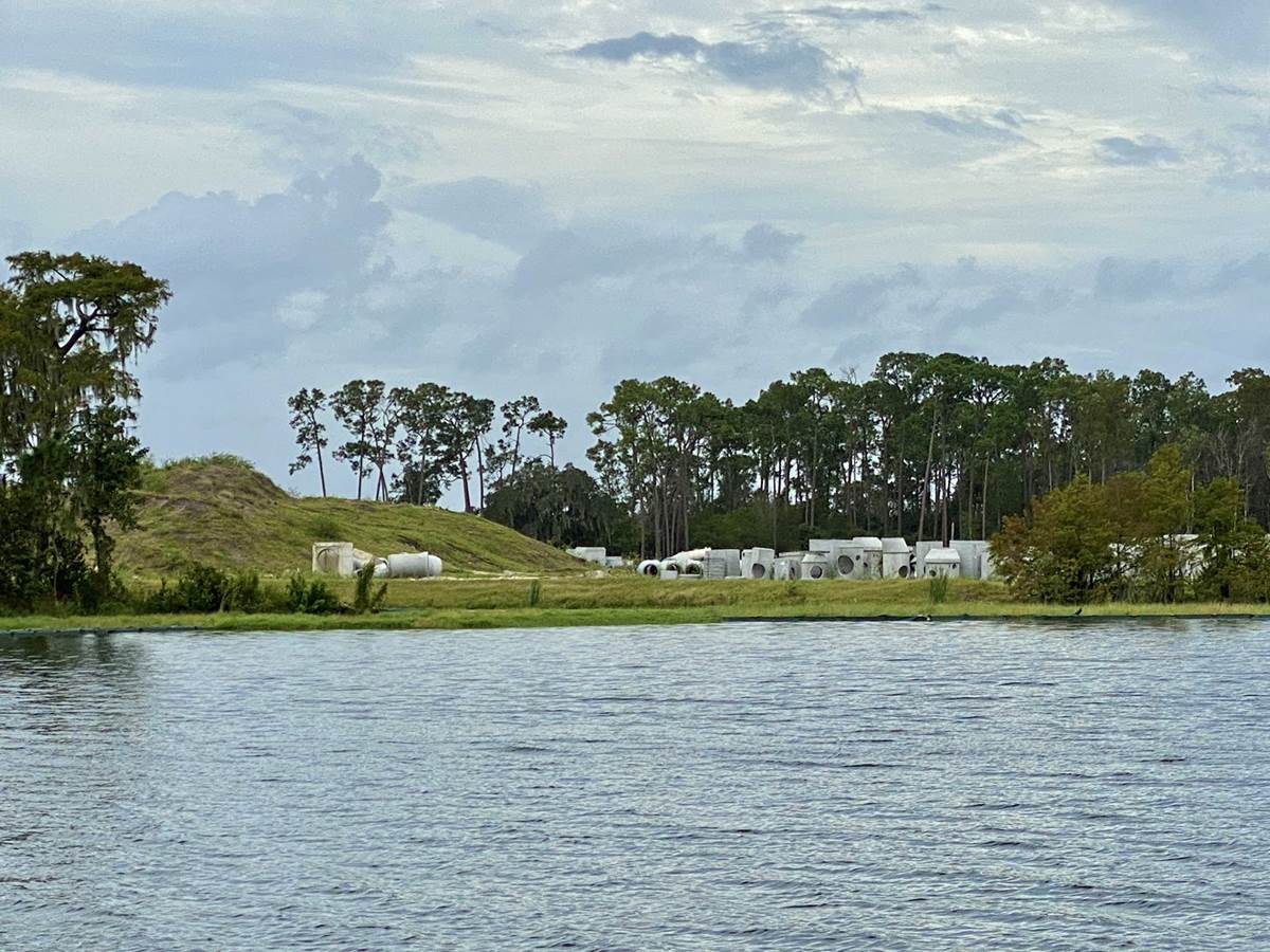 The gray spots through the trees in the above photos are concrete drainage pipes waiting to be installed. In photos today, taken by Orlando correspondent Jeremiah Good, they are still sitting in the same spot awaiting installation.