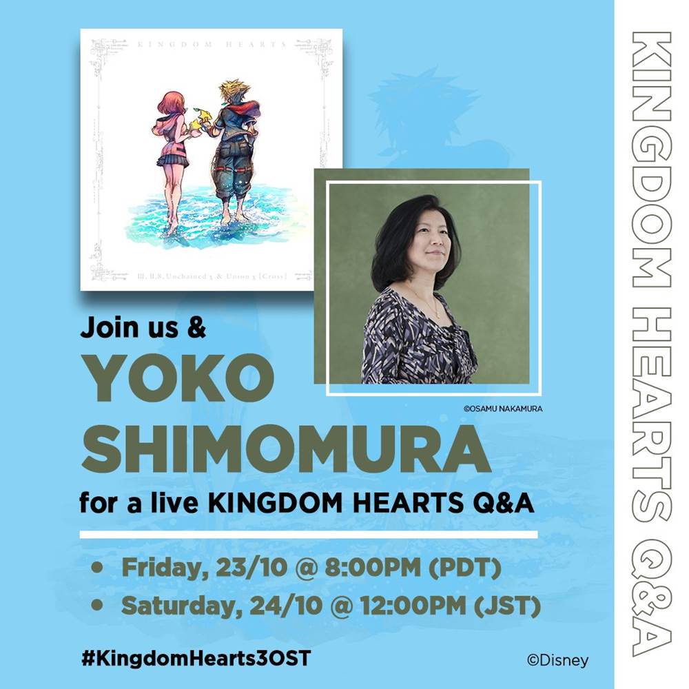 Disney Music is hosting a virtual Q&A with composer Yoko Shimomura to celebrate the release of the Kingdom Hearts III soundtrack and Kingdom Hearts Melody Of Memory.