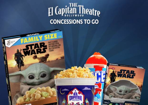 - For this weekend only, those who make a Concessions to Go purchase from El Capitan Theatre will receive a complimentary box of Mandalorian cereal from General Mills and a box of fruit-flavored snacks.