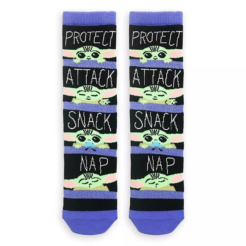 The Child ''Protect, Attack, Snack, Nap'' Socks for Women – Star Wars: The Mandalorian ($14.99) - “Be in step with the Child's daily routine when you don these soft, sparkly socks inspired by the character fans affectionately call ''baby Yoda'' and featuring the words: ''Protect, Attack, Snack, Nap.''”