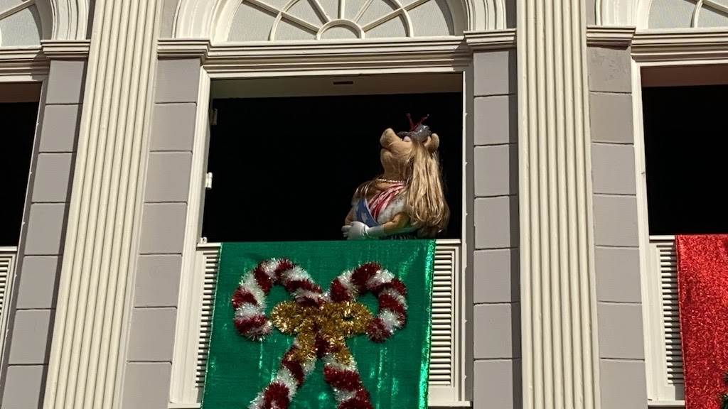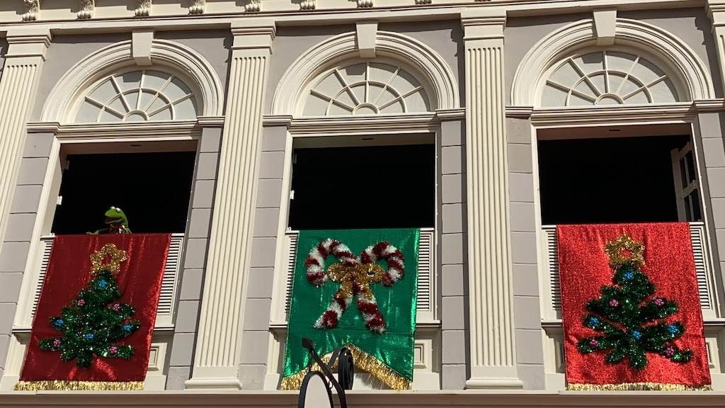 - Kermit, Miss Piggy, Fozzie, Sam Eagle and others take turns popping in and out of the windows of their colonial residence at Magic Kingdom.
