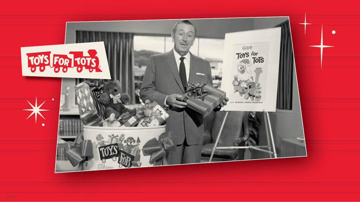 - Disney has a long relationship with the Toys For Tots Organization dating back to the beginning in 1947, when Walt Disney personally supervised the design of the Toys For Tots logo. During the holiday session, Walt Disney took to the airwaves and often featured Toys for Tots on his weekly television show Disneyland. Once Disneyland was built and open, the theme park became a premier location to drop off new and unwrapped toys. For more about the history of the partnership, you can read about it in this article from our archives.