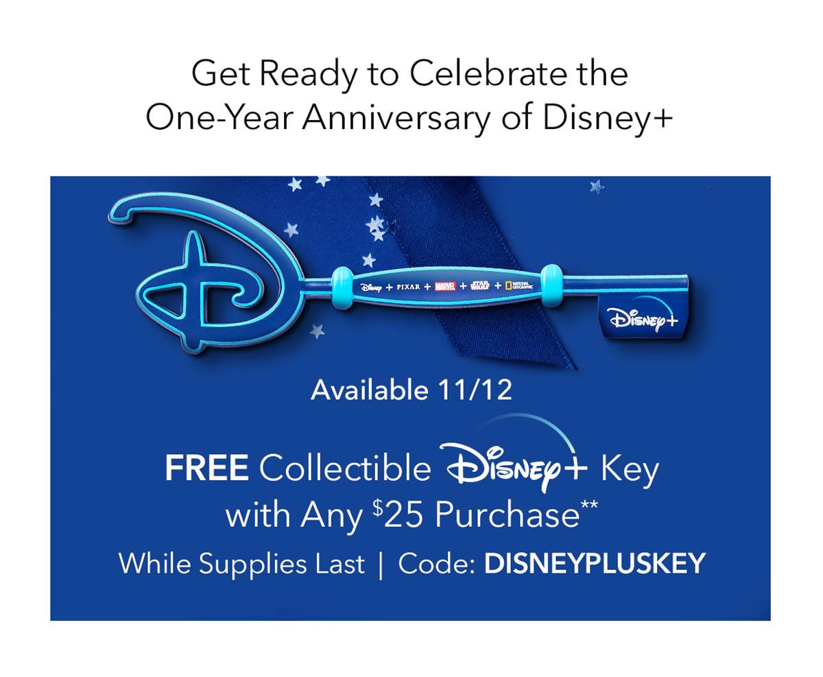 - In order to be eligible to receive a free commemorative key, Guests need to fill their cart with at least $25 worth of goods on shopDisney and use the promo code “DISNEYPLUSKEY” at checkout while supplies last starting November 12th.