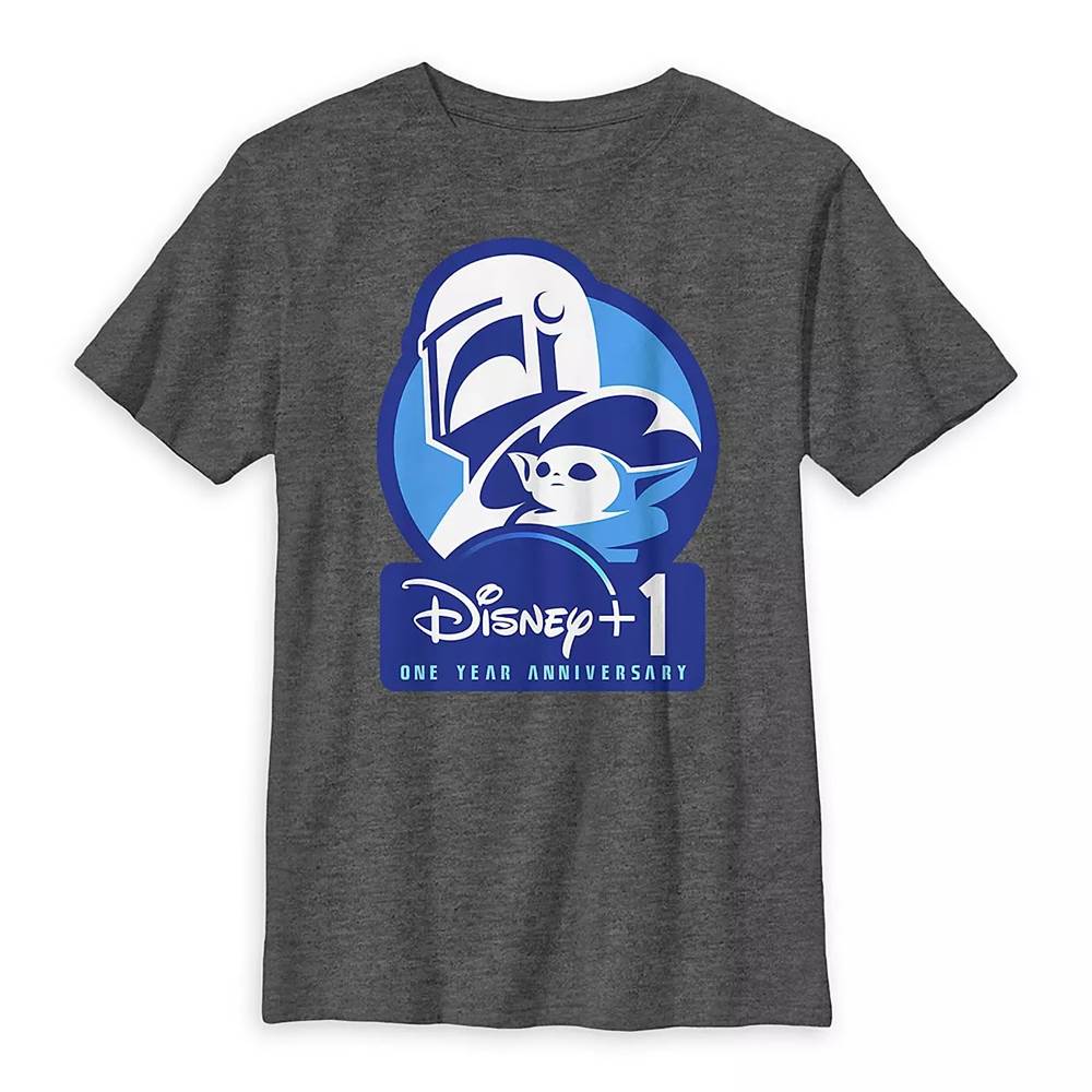 The Mandalorian and the Child Disney+ One Year Anniversary T-Shirt for Kids – Star Wars ($21.99) - “The lead characters of Star Wars: The Mandalorian celebrate our streaming service's one year anniversary with the ''Disney+ 1'' logo on a heathered jersey tee.”