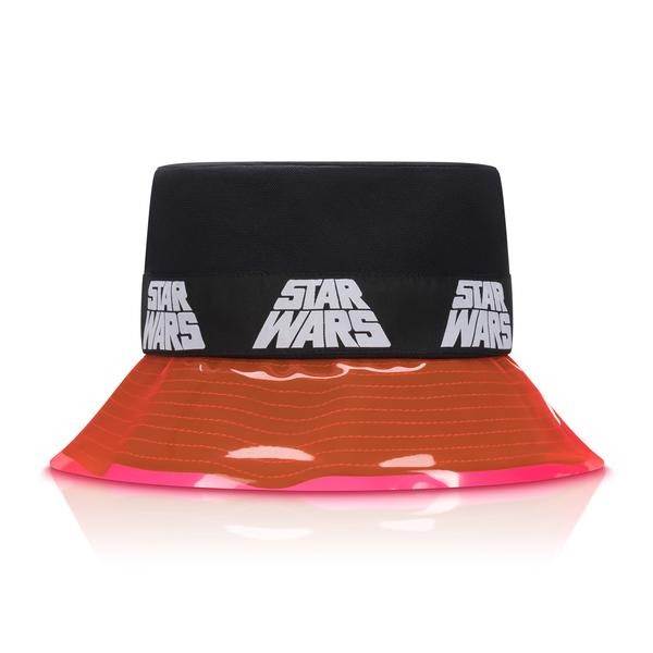 “Everyone has a dark side. A sturdy cotton canvas unisex bucket hat is layered with a contrasting red perspex. The lightsaber inspired piece casts a red shadow across the face of the wearer emulating the iconic glow.”
