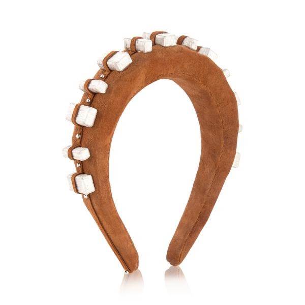“This textural headband is crafted from a shade of warm brown suede leather. Each piece is embellished with intricate silver detailing that is hand wrapped with metallic thread filaments for a reimagined take on Chewbacca's iconic bandolier.”