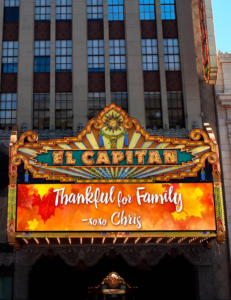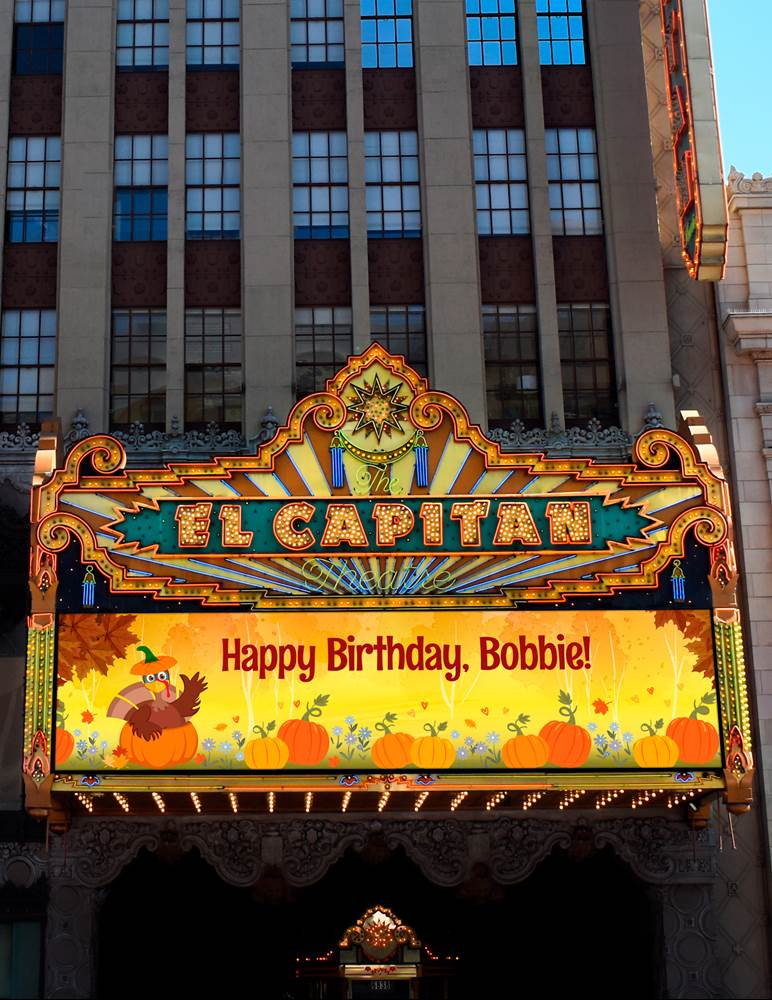 - Looking for a fun way to celebrate a milestone? Then say it with a marquee! Birthdays, anniversaries, holidays and more! Order a personalized marquee graphic to be featured on the world famous El Capitan Theatre marquee on Hollywood Boulevard! Digital & Live Packages Available, and just launched: New Fall Themes!