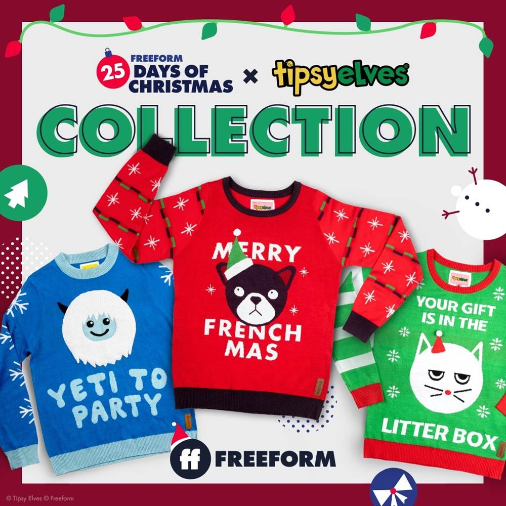 - Freeform is spreading holiday cheer alongside Tipsy Elves this year, as the two brands team up to design three “ugly” Christmas sweaters in celebration of 25 Days of Christmas programming.