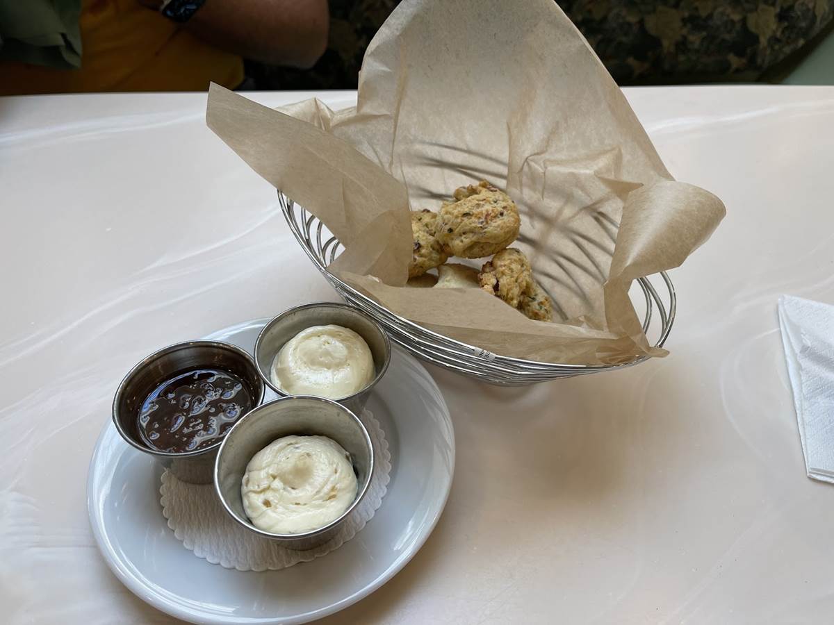Starterts behind with Homestyle Buttermilk and Cheddar Bacon Biscuits served with honey butter, caramelized onion butter and hot pepper jelly.