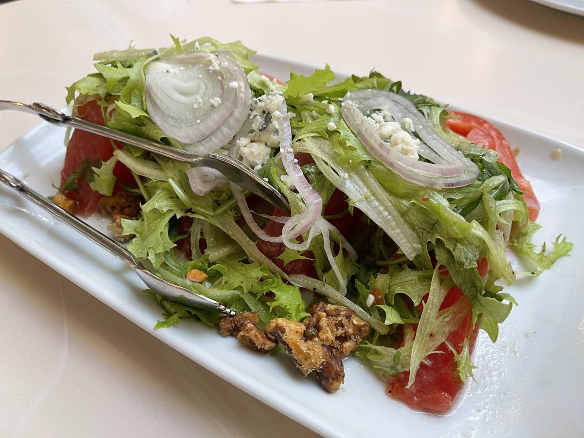 Next is a Seasonal Salad that currently features tomato and watermelon, crisp greens, blue cheese, candied walnuts and hot pepper jelly vinaigrette