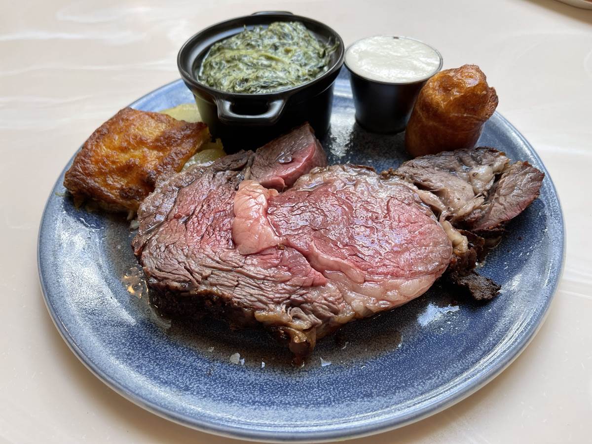 From the entree menu, we selected two items. First is the Fire-roasted Prime Rib of Beef, one of the best prime ribs on Disney property. It’s accompanied by asiago potatoes au gratin, creamed spinach and horseradish cream.