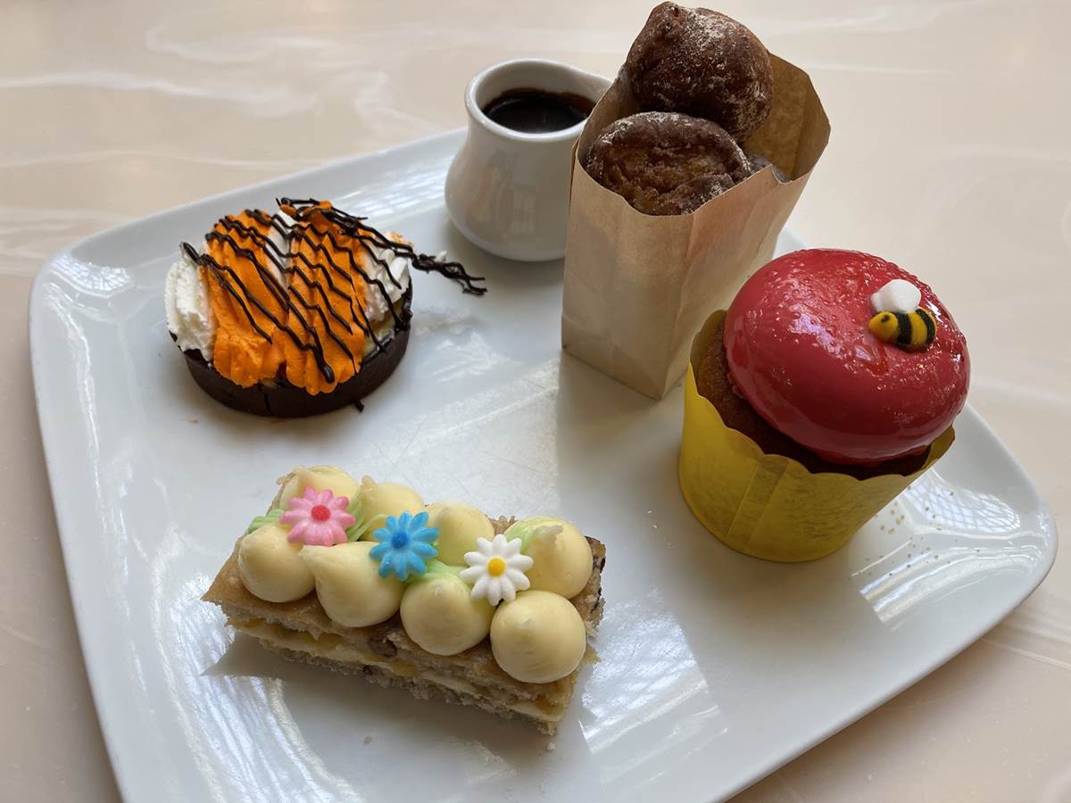 The Family Style Dessert Platter includes seasonal fritters with powdered sugar and chocolate dipping sauce, banana cream pie, hummingbird cake, and a honey cupcake.