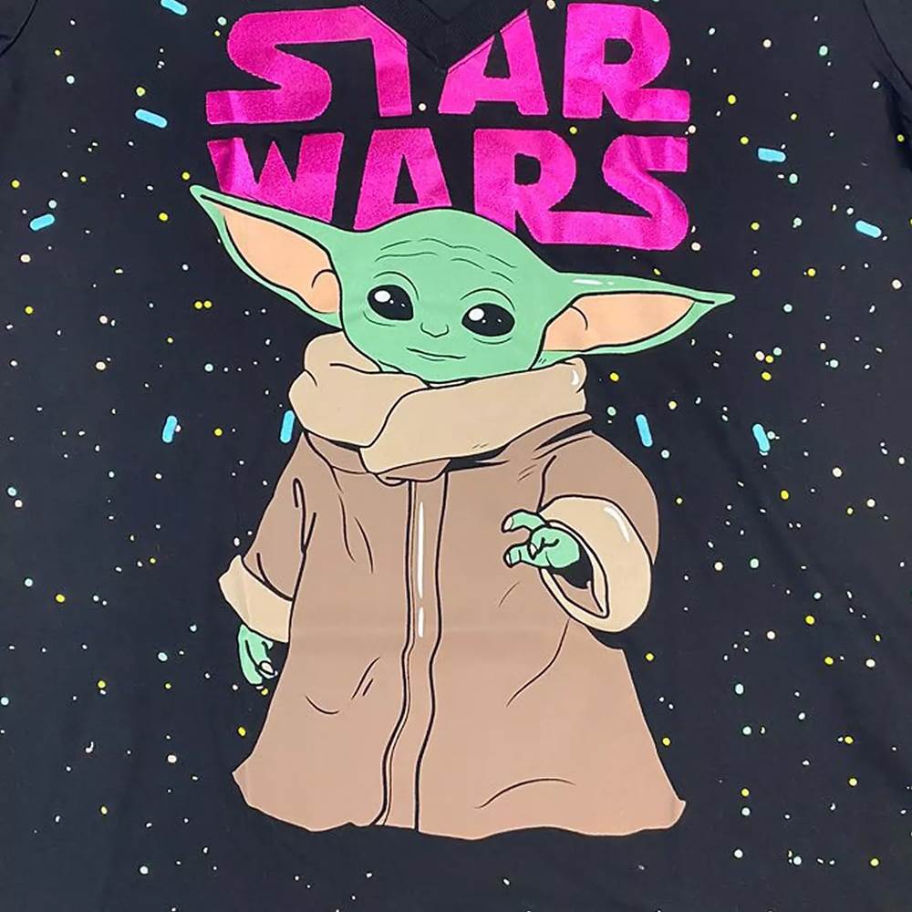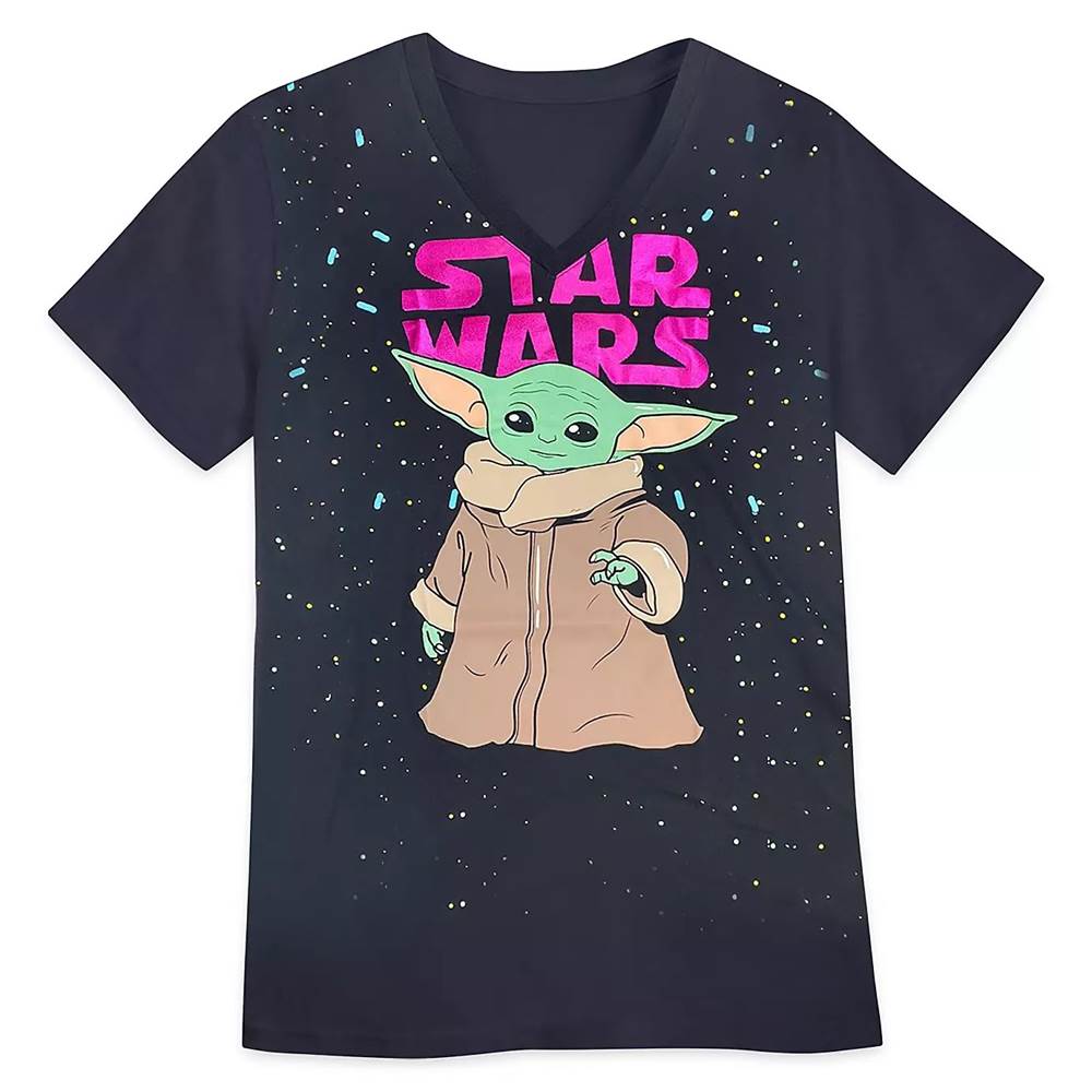The Child T-Shirt for Women – Star Wars: The Mandalorian ($24.99 - $26.99) - “Journey to a galaxy far, far away in this v-neck Grogu tee with textured Star Wars logo and splatter art starfield background.”