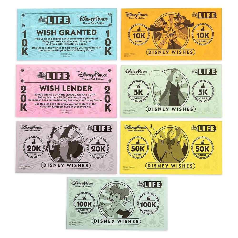 - Wishes replace money and feature characters like the Blue Fairy, Flora, Fauna, Merriweather, Merlin, Fairy Godmother, and Tinker Bell on the bills.