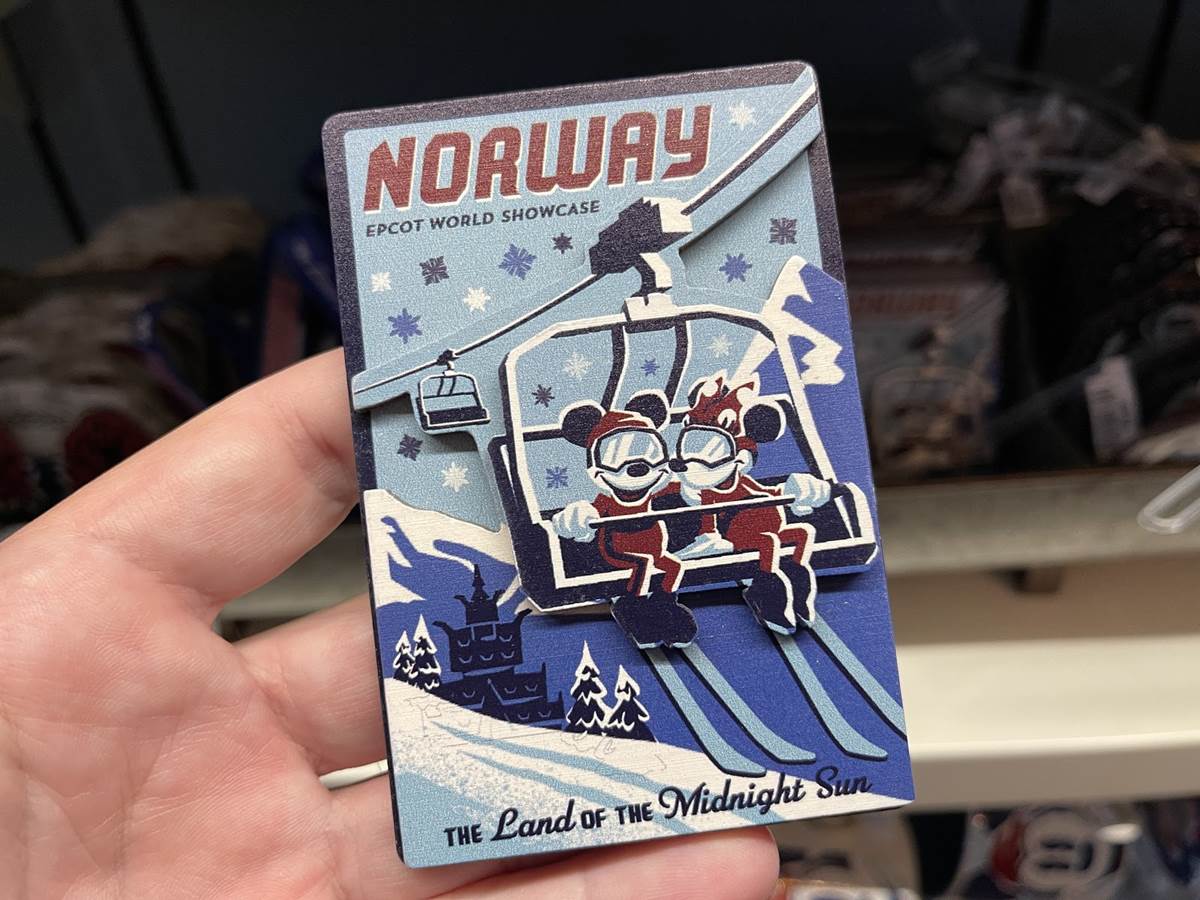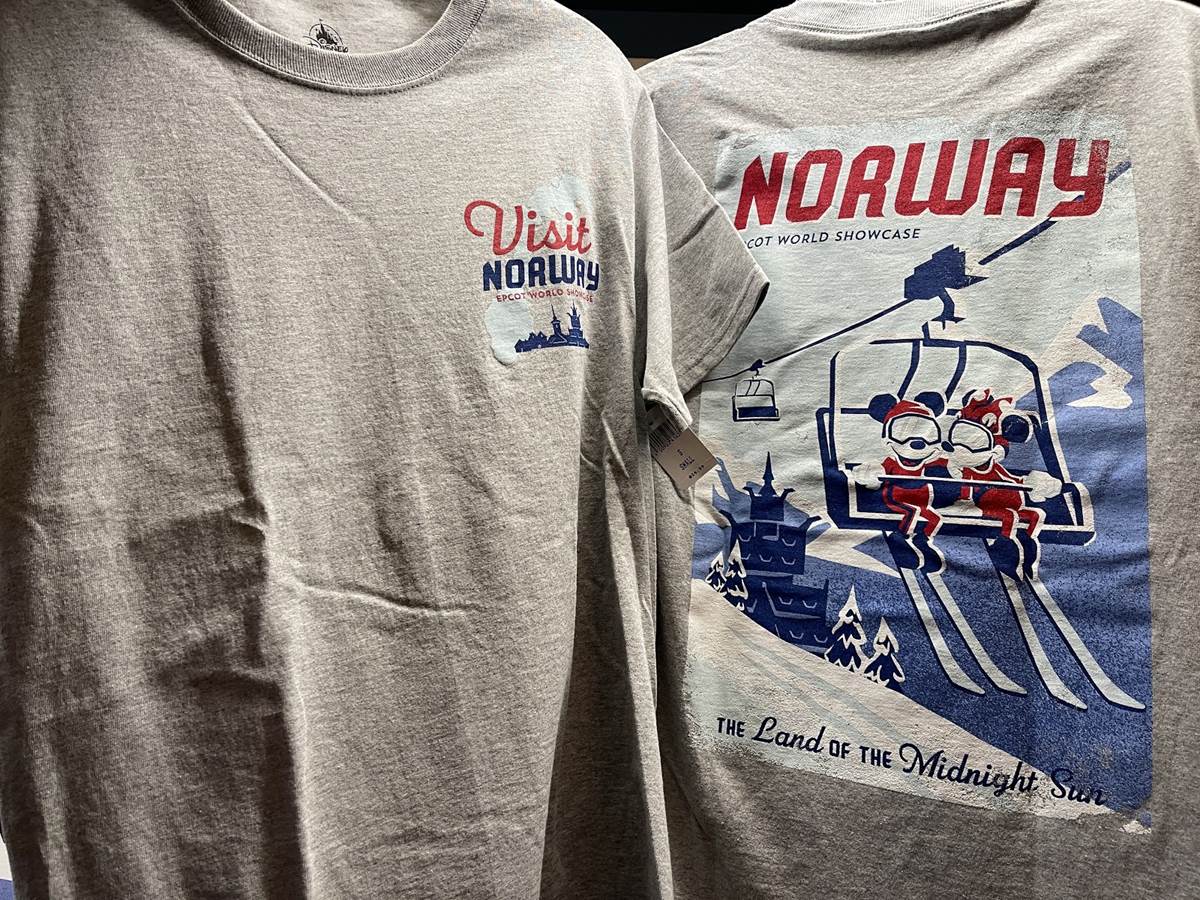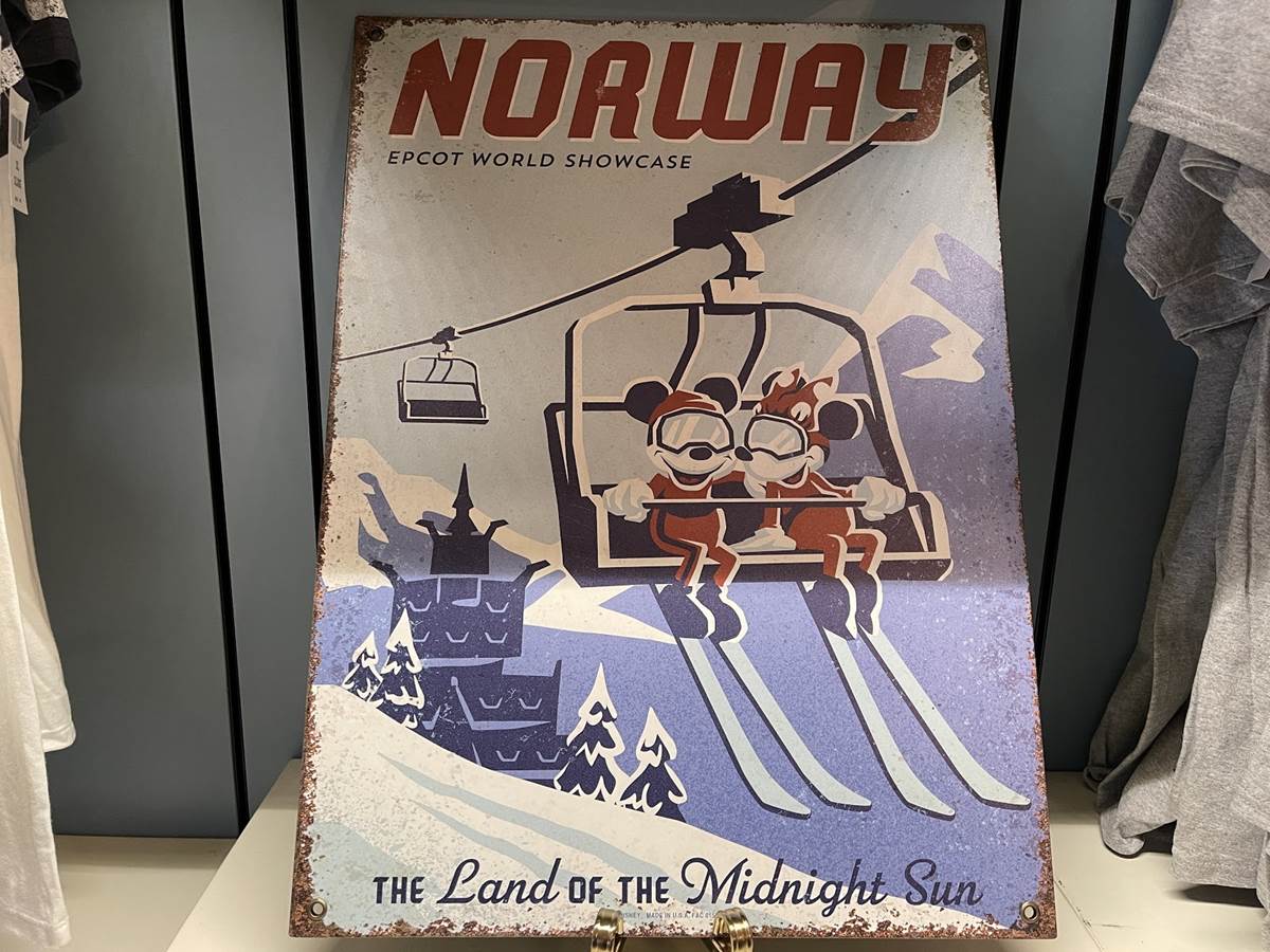 New merchandise has hit the shelves of the Norway pavilion in EPCOT’s World Showcase at Walt Disney World. The merchandise all has a “Ski Norway” theme featuring Mickey Mouse and Minnie Mouse wearing ski apparel. The phrase “Land of the Midnight Sun” is also emblazoned on many of the new goods offered as well.