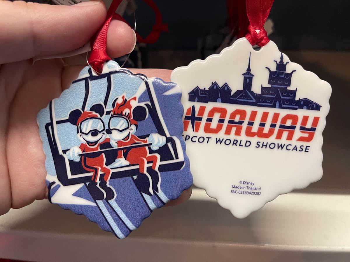 An ornament features Mickey and Minnie on a ski lift on one side and the skyline of the Norway pavilion on the other for $16.99.