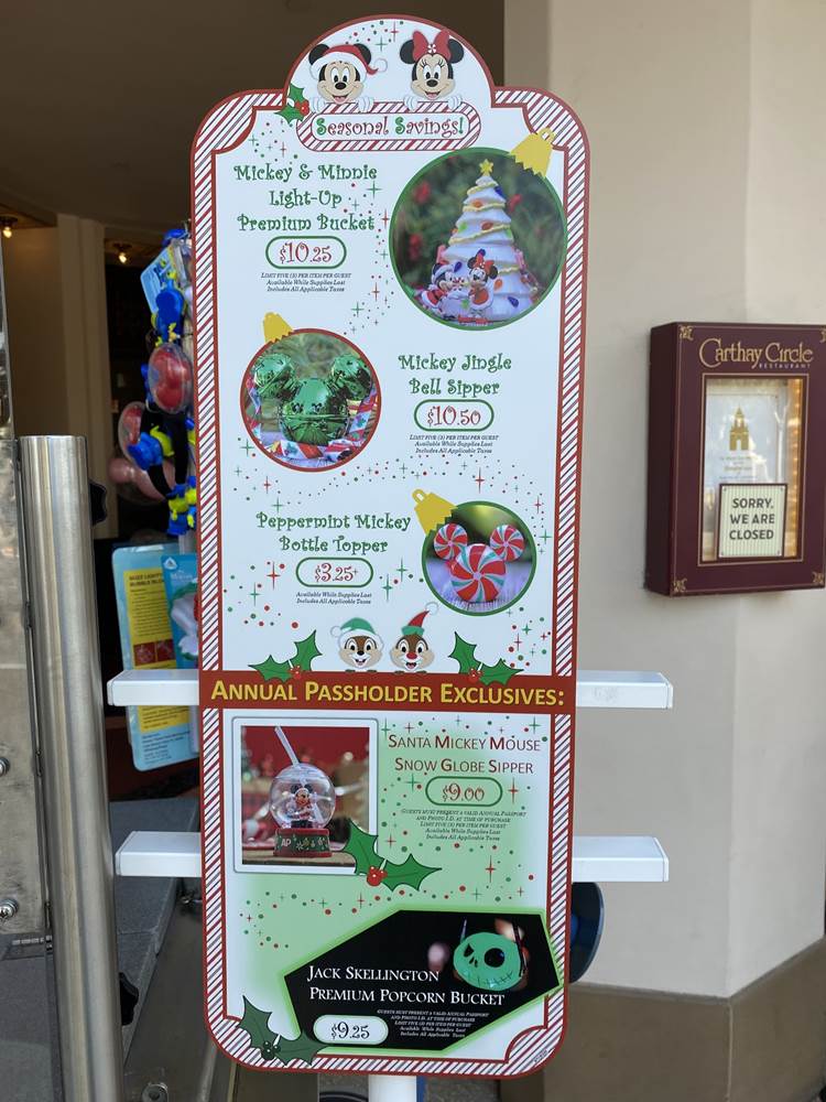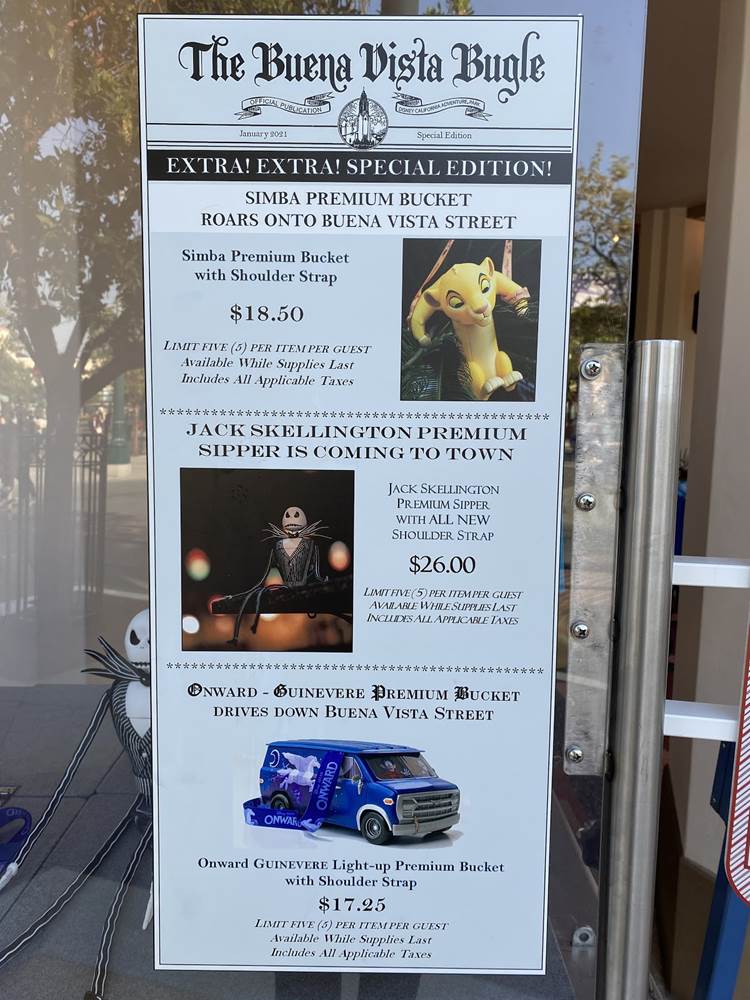 While popcorn buckets are still for sale at the carts on Buena Vista Street, actual popcorn will not be included with the bucket, as again, no food can be consumed on Disney property at this time.