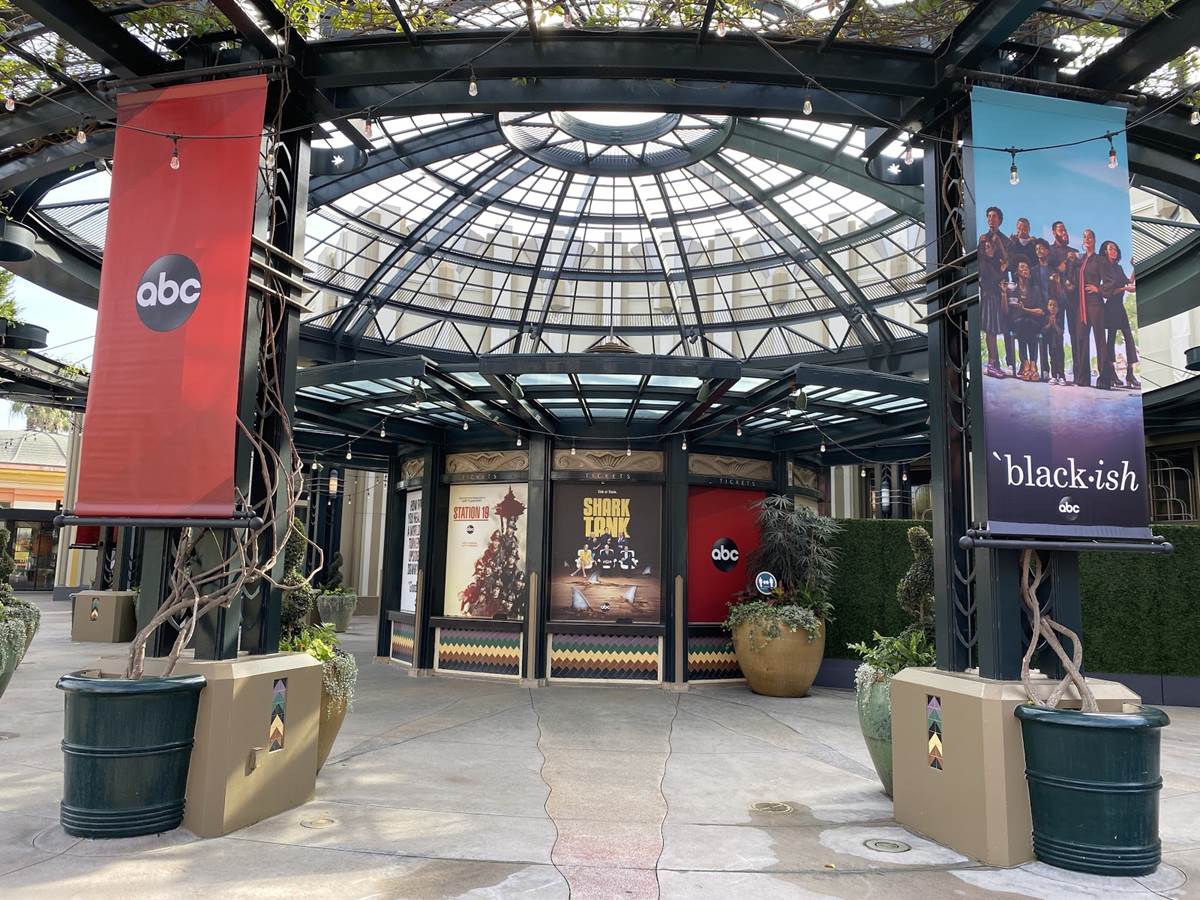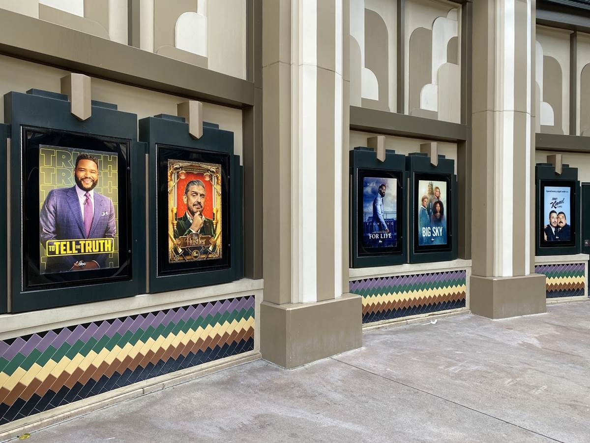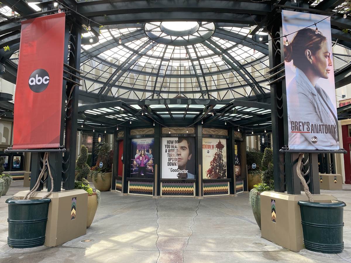 As we come in from the west side entrances near the still-closed hotels of the Disneyland Resort, we can see that over at the former AMC Theaters location, slots that would once occupy posters for the latest blockbuster film to be screened at the location now occupy posters advertising the programming this season on ABC.