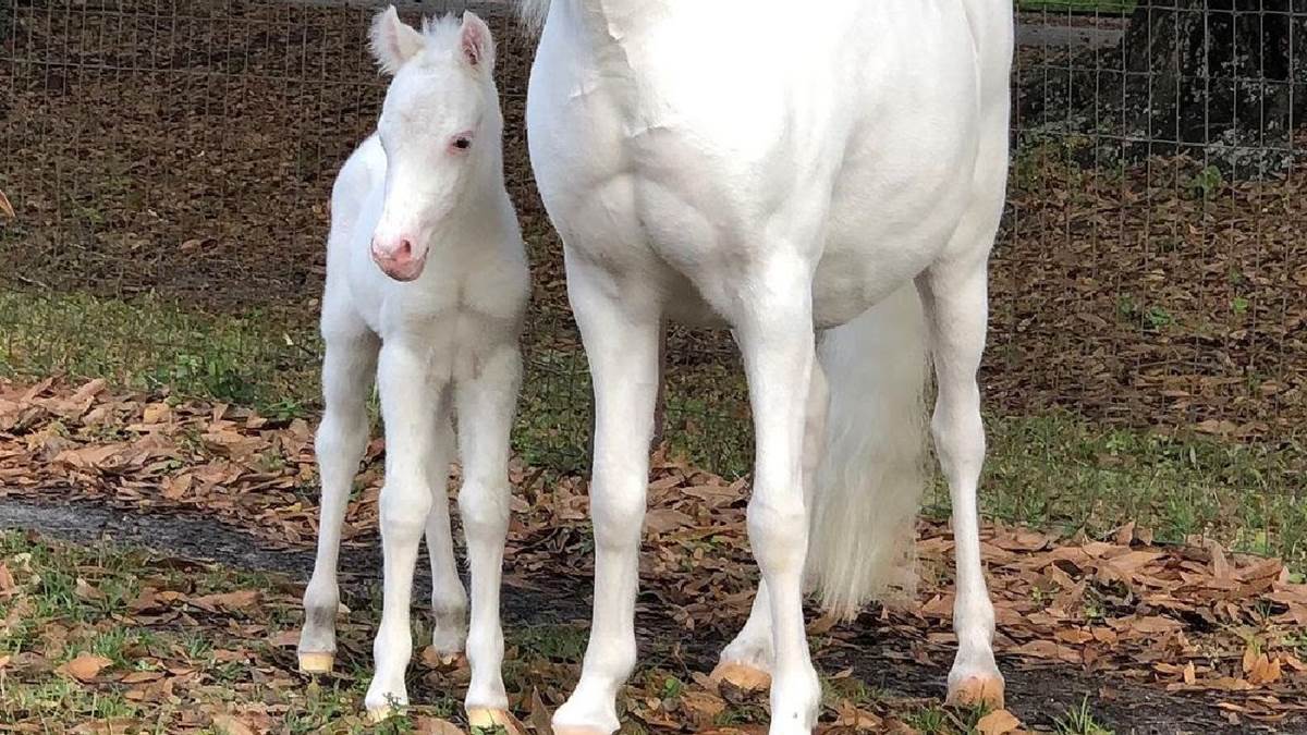 Walt Disney World veterinarian Dr. Mark Penning shared a picture and video of the newest baby born on property, a white pony named Obie at the Tri-Circle-D Ranch.