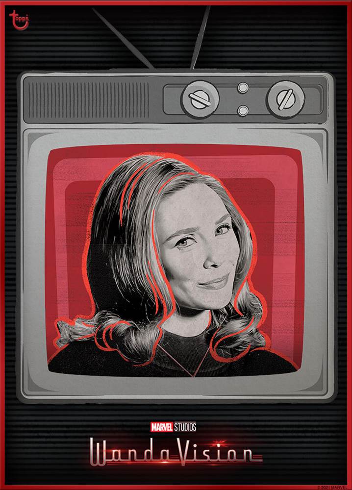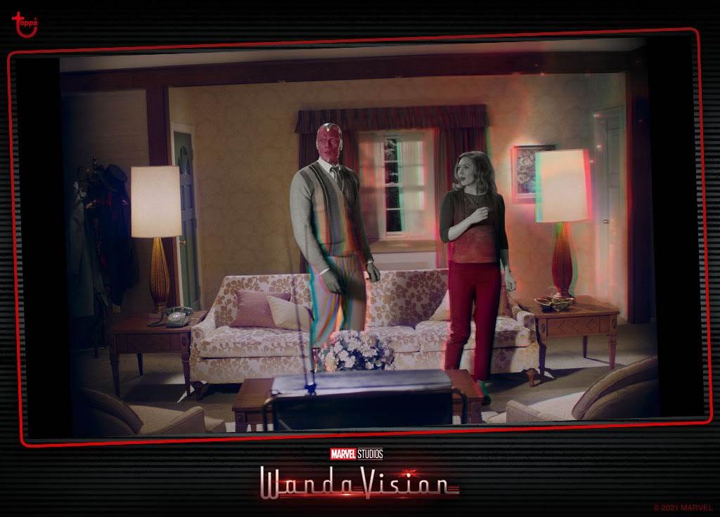 - As the world is introduced to the two super-powered beings, Wanda Maximoff and Vision, living idealized suburban lives, Topps is kicking off an ongoing series of card releases surrounding the latest show from Marvel Studios. This week’s release includes a 27-card set highlighting some of the best moments from the show’s trailer, and an 11-card TV set, featuring dynamic images of Wanda and Vision wrapped in vintage TV sets.