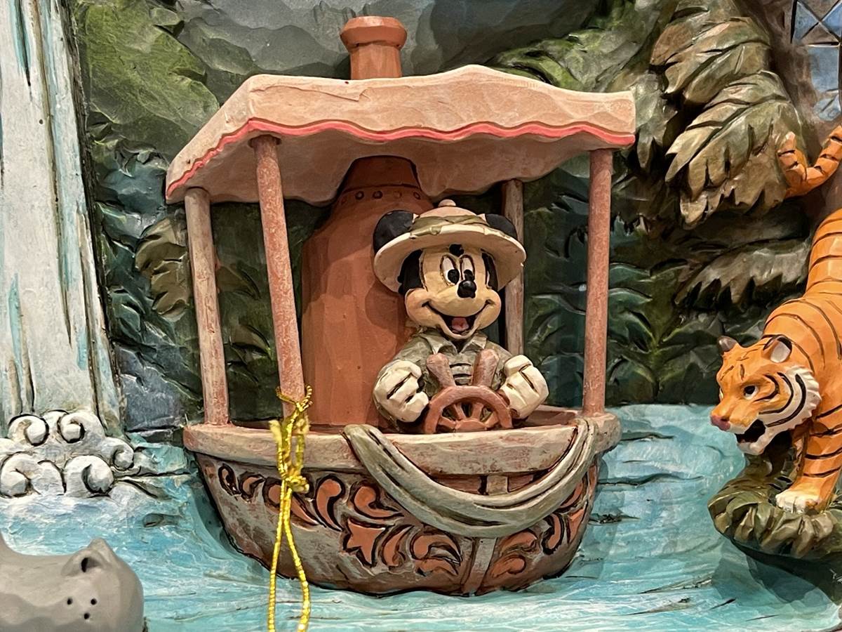 A new Jim Shore figurine was spotted today at Disney Springs that features Mickey Mouse as a skipper on the “World famous” Jungle Cruise. The figure features Jim Shore’s signature filigree around the base and folksy checkered print on the trees, while the majority of the figure echoes the exotic locales seen throughout the classic attraction.