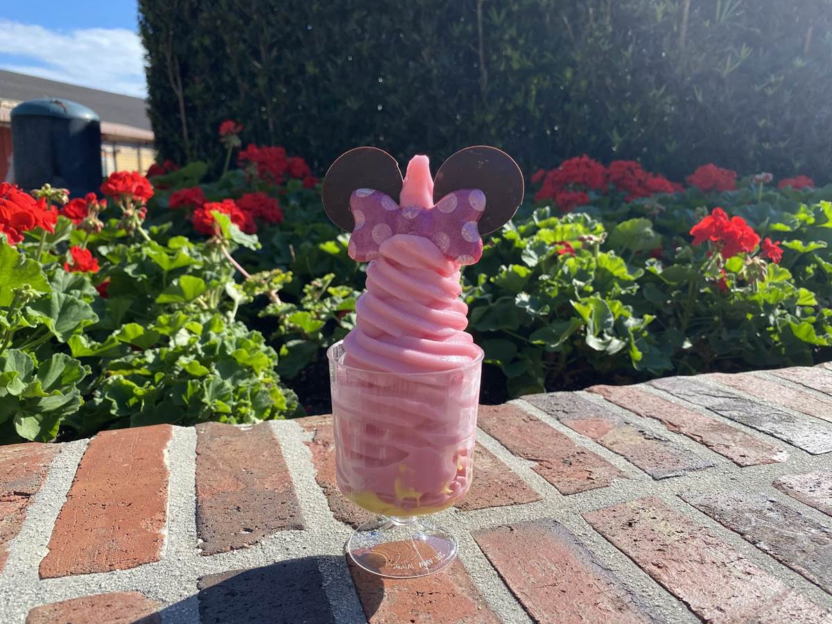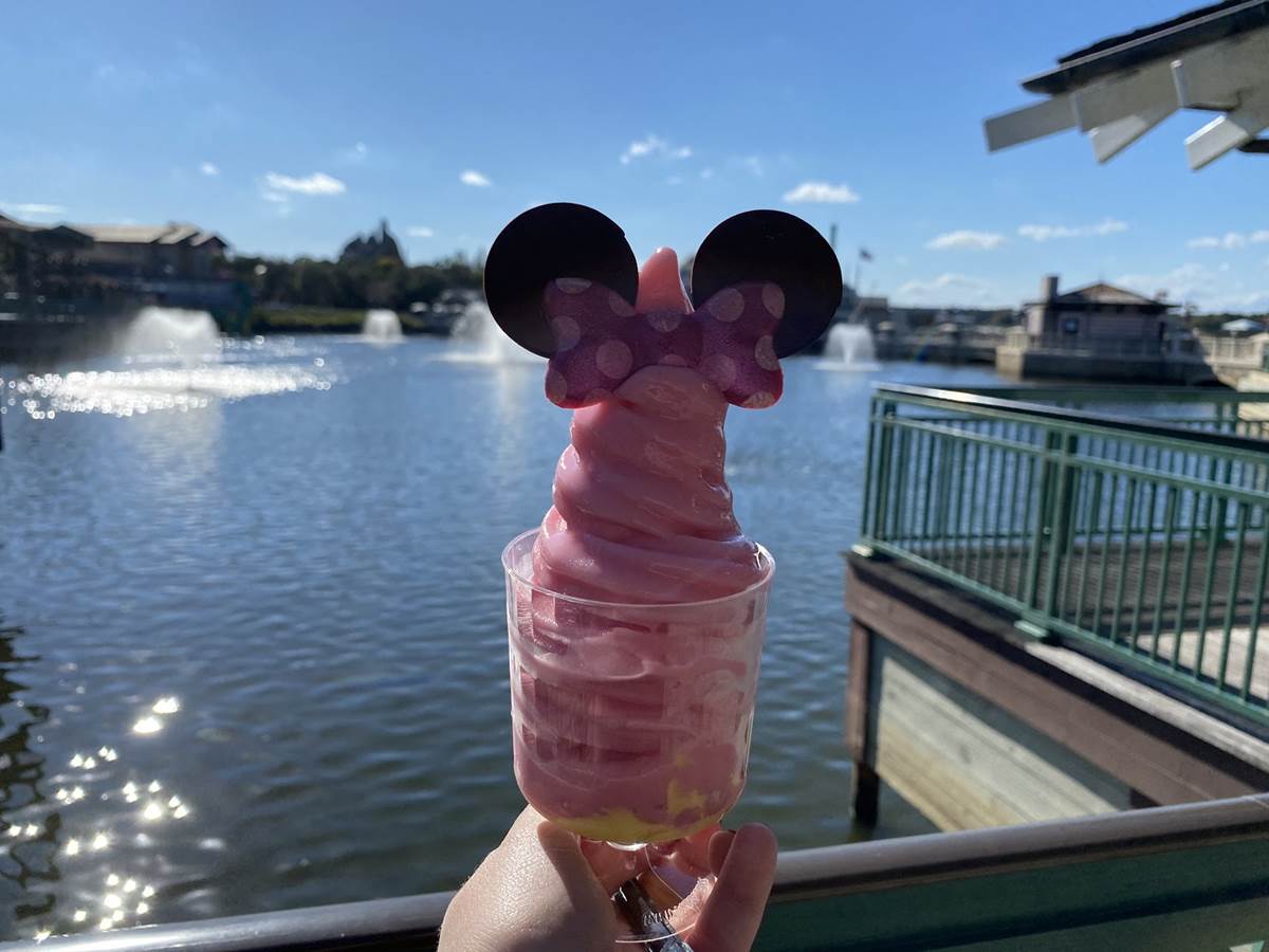 Friend of Laughing Place Mikayla Burridge tried the Minnie DOLE Whip Watermelon Cup today and had this to say: “It tasted like a watermelon Jolly Rancher! I really enjoyed it. It was a good size, more would’ve been too much. It wasn’t as tart as lime or even pineapple, so if that’s what you’re looking for, it’s just right! The little pearls on the bottom added nice texture, but I wasn’t crazy about whatever pineapple thing was on the bottom… It had a frosting-like texture. Overall, 9/10!”