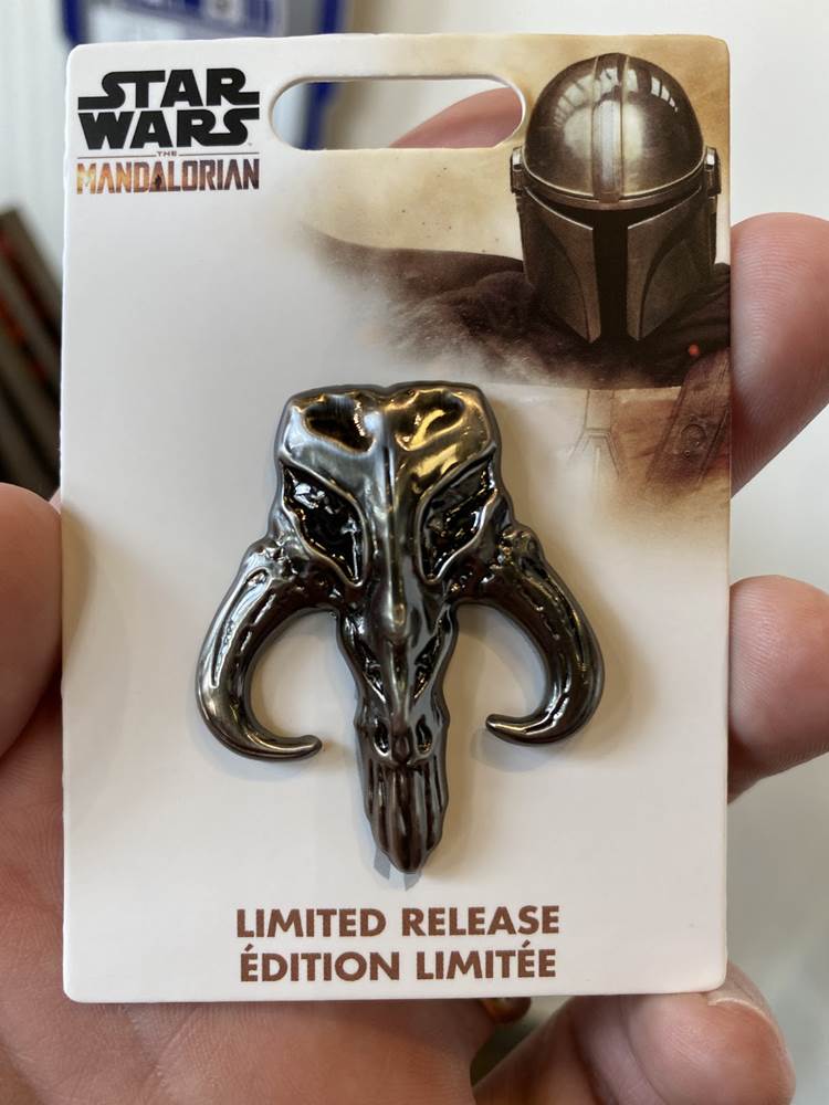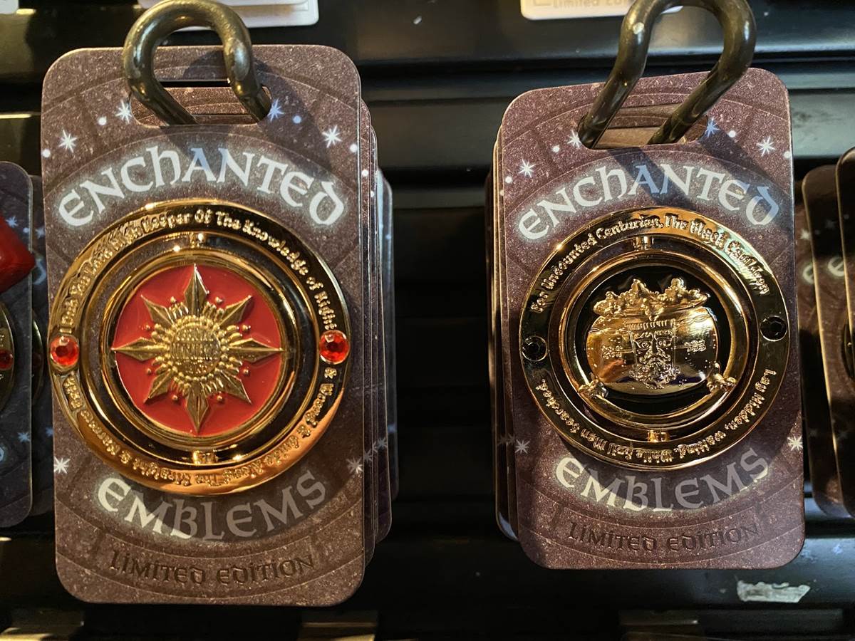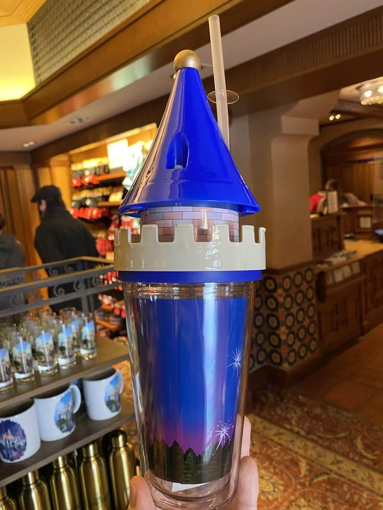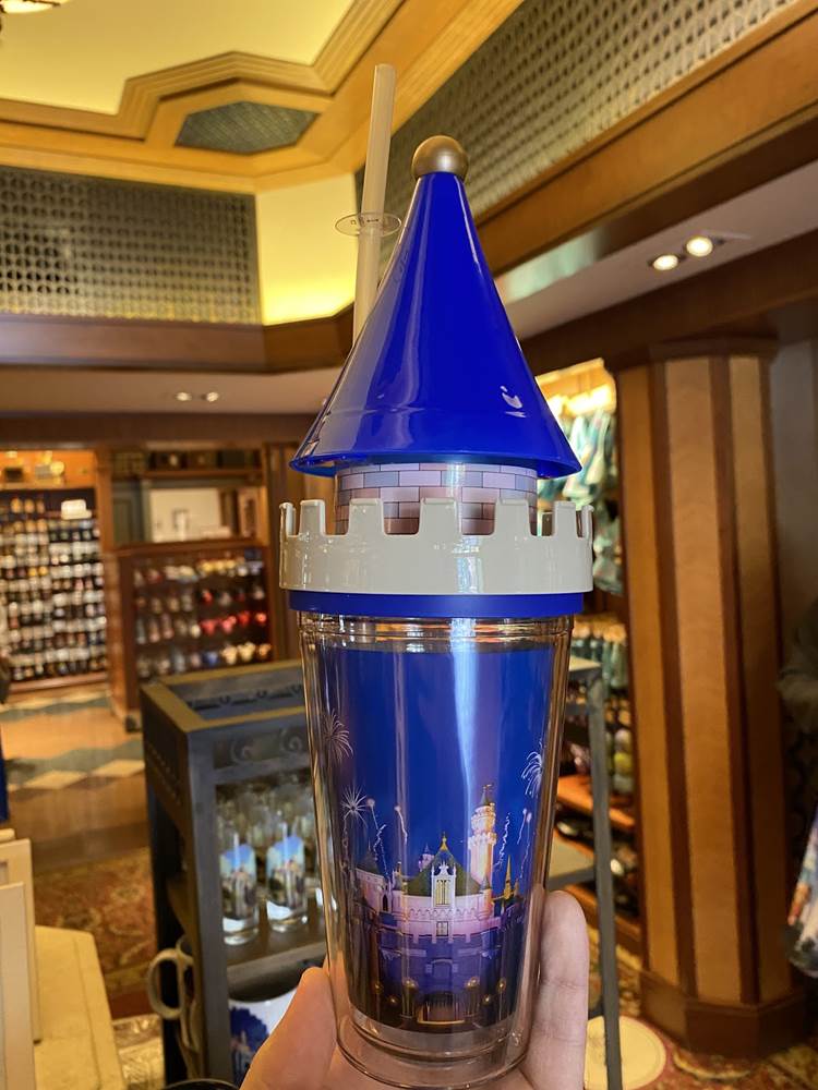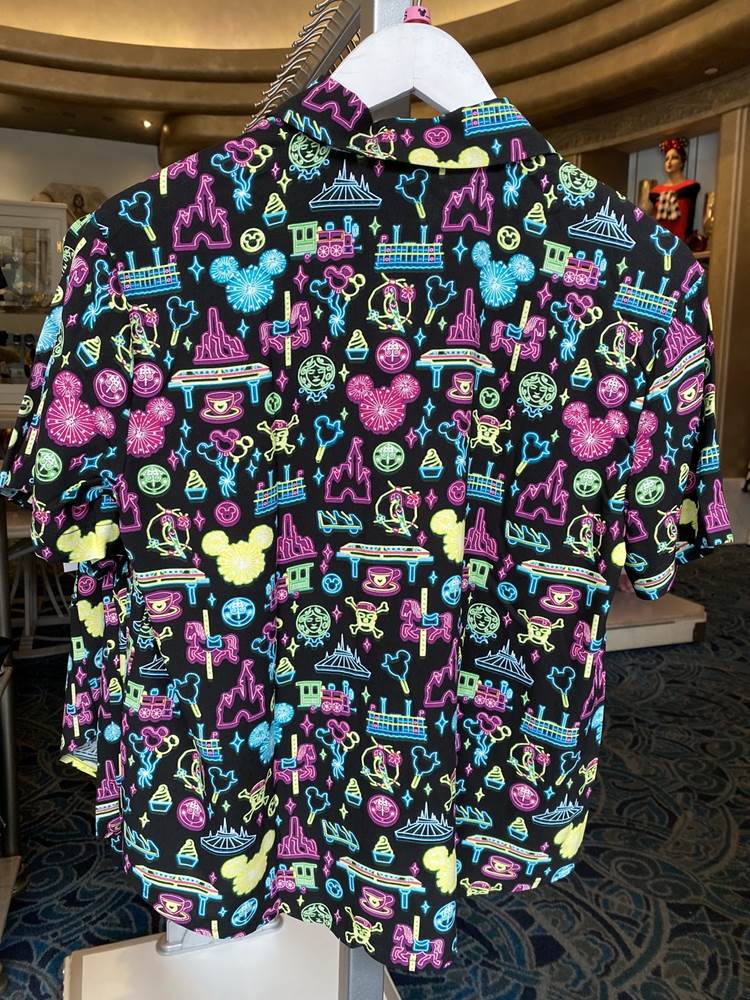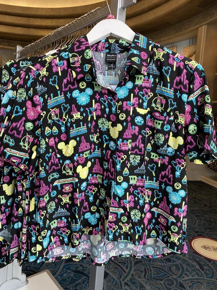 Back on Buena Vista Street we saw this fun Mickey button-down shirt, some “Enchanted Emblems” pins, and a castle turret sipper cup.