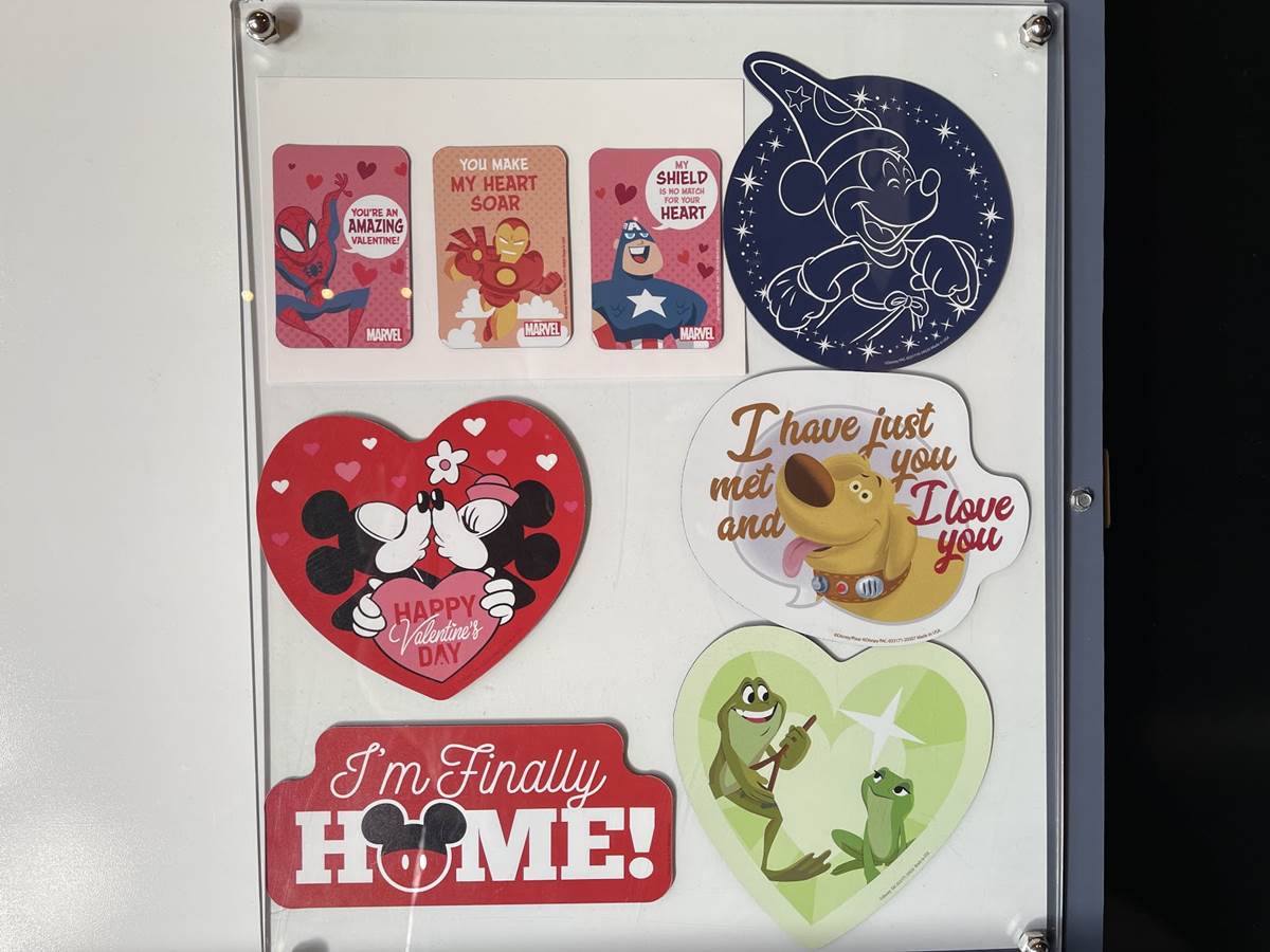 Using some of the same artwork, MagicBands include a couple’s Mickey and Minnie band and the Marvel Valentine candy hearts option.