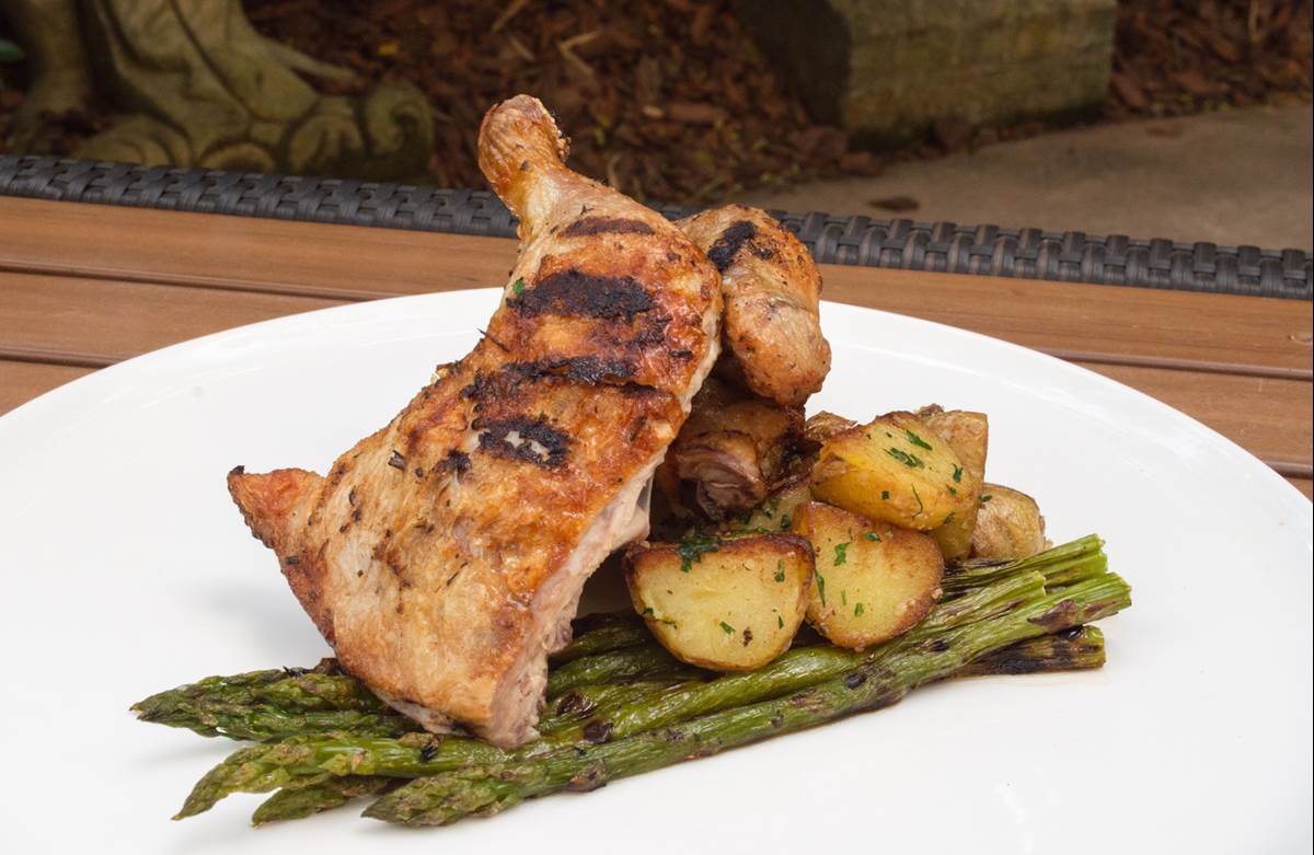 - Description: Freshly roasted chicken served with roasted tri-color potatoes and grilled asparagus